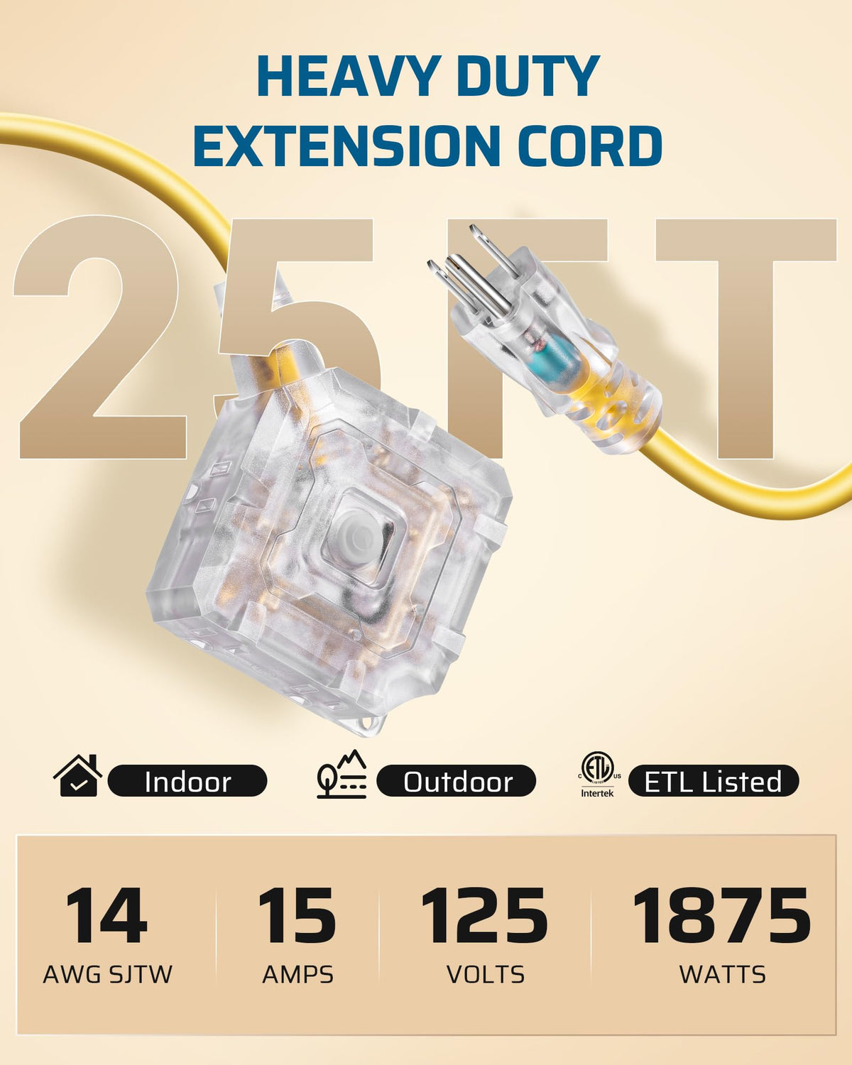 Dewenwils 25Ft Outdoor Heavy Duty Extension Cord, 14 Awg Sjtw Power Cord With Dust Proof & Waterproof Switch, 6 Outlets Transpar