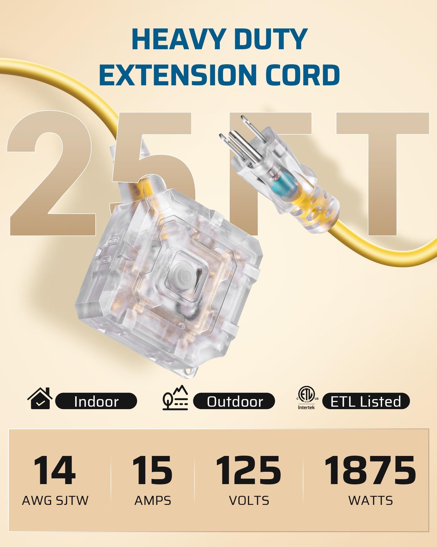 Introducing The Dewenwils 25Ft Outdoor Extension Cord, Your Ultimate Solution For Reliable And Weatherproof Power Supply Both Indoors And Outdoors! Heavy-Duty Construction: Constructed With High-Quality Materials, The Dewenwils 25Ft Outdoor Extension Cord Is Designed To Withstand The Rigors Of Outdoor Use. The Yellow Heavy-Duty Cord Features A 14 Awg Sjtw Weatherproof Power Cable, Ensuring Durability And Long-Lasting Performance In Various Weather Conditions. Multiple Outlets: With 6 Built-In Outlets, This Extension Cord Provides Ample Power Supply For Your Outdoor Devices And Equipment. From Garden Tools To Holiday Decorations, You Can Easily Connect Multiple Devices Without The Hassle Of Constantly Swapping Cords. The Lighted Outlets Also Indicate When The Power Is On, Adding Convenience And Safety To Your Setup. Weatherproof Design: Engineered For Outdoor Use, The Dewenwils Extension Cord Is Weatherproof And Suitable For Use In Rain, Snow, Or Sun. The Sjtw Weatherproof Power Cord Is Designed To Resist Moisture And Withstand Harsh Outdoor Elements, Ensuring Reliable Performance Year-Round. Specifications: -Input Voltage: 125Vac 60Hz -Max Power Rating: 15A 1875W -Length: 6Ft, 10Ft, 15Ft, 25Ft(Optional) -Cord: Sjtw 14/3C Packing List: - Extension Cord X 1