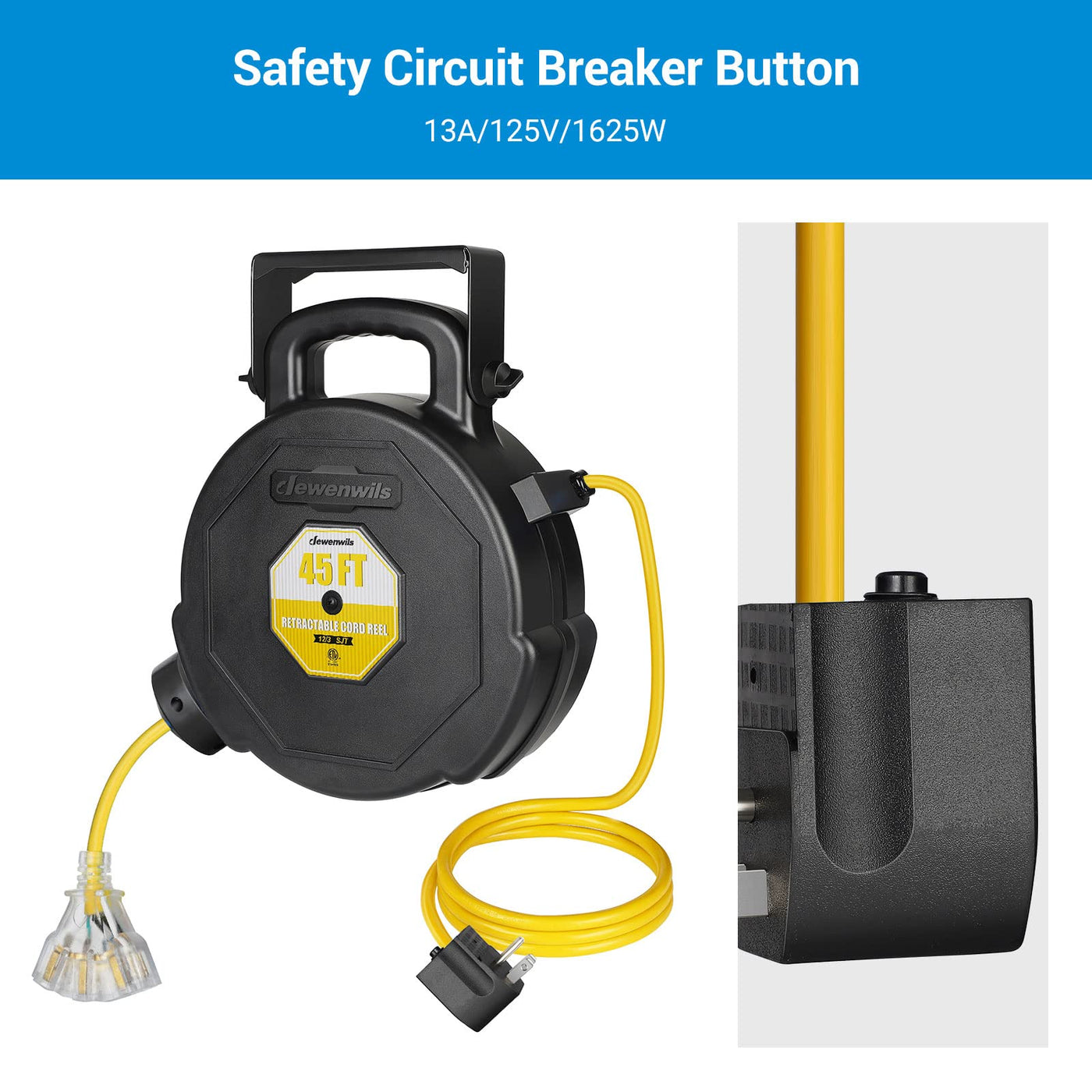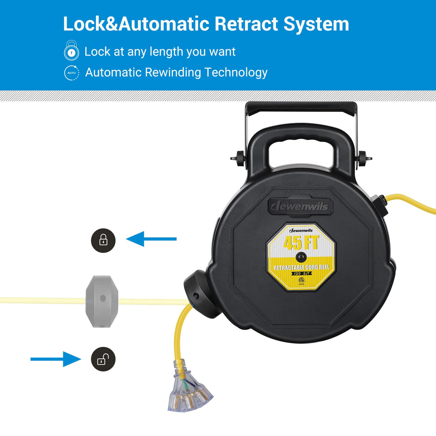 Dewenwils Auto-Rewinding Extension Cord Reel Features: 12Awg/3C 45Ft Power Cord, Which Is Ideal For Garage, Basement, Workshop Or Jobsites Use. 180Degree Swivel Bracket & Portable Handle Makes You Fix The Extension Cord Reel On Wall Or Carry To Jobsites. Auto-Retractable Function: Flexible To Lock At Any Length And Labor-Saving.