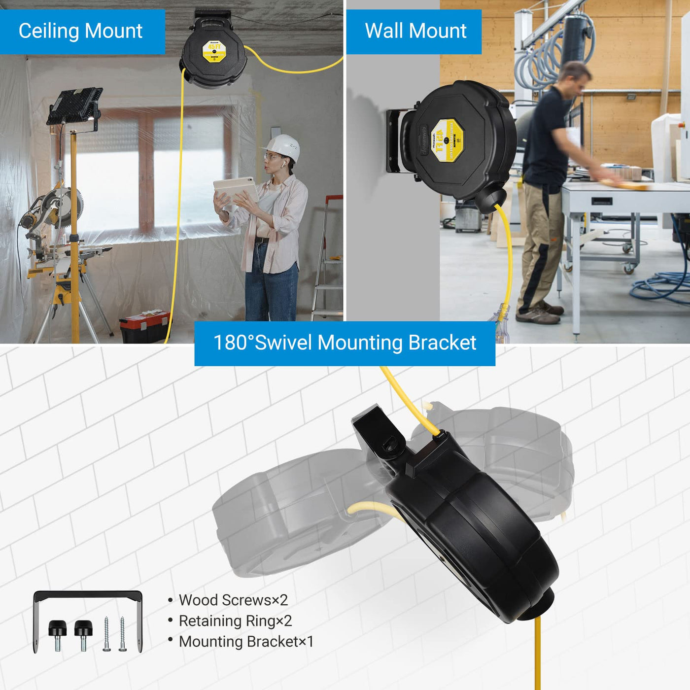 Q: Can the extension cord reel be mounted on the wall or ceiling?A: Yes, the DEWENWILS extension cord reel is designed for versatile installation and can be easily mounted on both walls and ceilings using the included mounting bracket and screws.