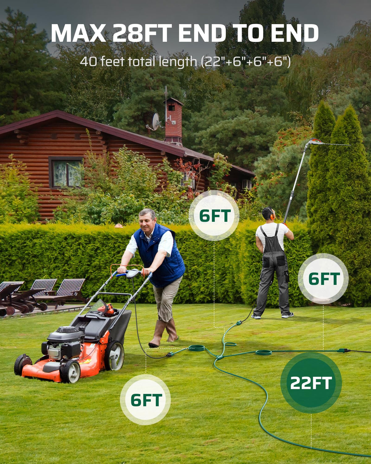Q: What is the maximum length of the DEWENWILS Outdoor Extension Cord?A: The DEWENWILS Outdoor Extension Cord has a total length of 40 feet, which includes a 22-foot main cord and three additional 6-foot extensions, allowing you to reach up to 28 feet from the end for convenient outdoor use.
