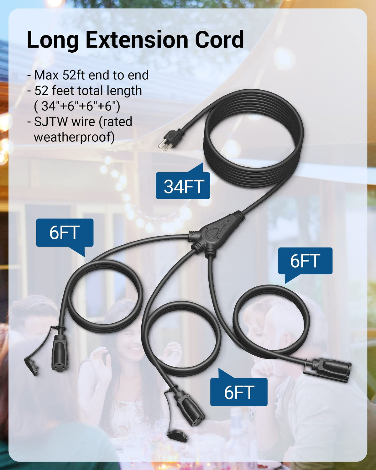 Q: How long is the DEWENWILS Outdoor Extension Cord, and how is it divided?A: The DEWENWILS Outdoor Extension Cord is a total of 52 feet long, divided into four parts: a 34-foot main power supply cable and three 6-foot branch cables, allowing for flexible placement of outdoor devices.