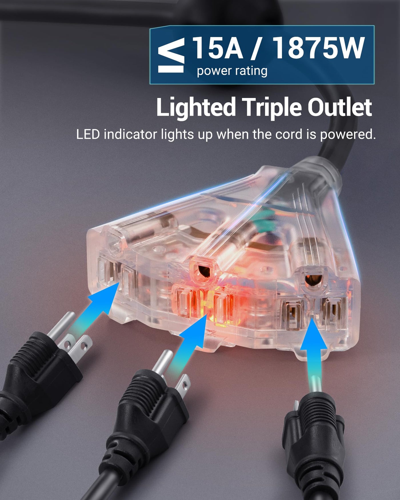 Dewenwils Retractable Extension Cord Reel, 40 Ft Heavy Duty Power Cord, 12Awg/3C Sjtow, 3 Grounded Outlets Lighted Triple Tap, 1