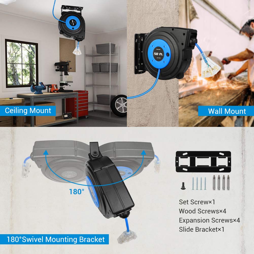 Dewenwils 50 Ft Retractable Extension Cord Reel With Lighted Triple Tap And 13 Amp Circuit Breaker 14Awg/3C Sjtow Cord Made Of Impact-Resistant Polypropylene Case And 14-Gauge Sjtow Cord, Dewenwils 50 Feet Retractable Heavy Duty Extension Cord Reel Is Sturdy And Rugged And Can Withstand The Abuses Of A Busy Garage Or Shop. It Has A Clever Auto-Guide Rewind Mechanism To Avoid Kinks And Tangles. The Power Cord Reel Retracts Quickly And Smoothly And The Ratcheting System Will Lock The Cord At Any Length Or You Can Select A Non-Lock Mode. The 14-Gauge Sjtow Cord Can Resist Oil, Alkalies, Ozone, Acid, Cold Weather And Gives Flexibility, Lightness, And Durability. The Mounting Bracket Can Rotate 180 Degrees. The Illuminated Three-Outlet Female, Adjustable Cord Stopper, And Built-In Circuit Breaker With Reset Button Make This Reel Perfect For Almost Any Workshop Setting. Swivel Mounting Bracket Once The Cord Is Installed On The Wall Or Ceiling, The Swivel Mounting Bracket Will Allow Flexible Rotation Within 180 Degree Following The Cable Movement. The Cord Reel Will Turn Toward You As You Work. 13A Circuit Breaker With Reset Button Built-In 13A Circuit Breaker Gives Peace Of Mind By Knowing You Won? Be Tripping Breakers Or Blowing Fuses. It Protects Devices Against Short Circuit And Overloads Which Will Automatically Cut Off Power Supply When The Total Current Of The Connected Devices Exceeds 13A. All You Have To Do Is Simply Reset The Circuit At The Reel. Lighted Triple Tap Outlet The Triple Tap Outlet Provides Plenty Of Room To Supply Power To Your Entire Project Without Ever Having To Unplug, And You Will Easily Find Out The Power Before You Ever Plug In By Seeing The Lighted Triple Tap Connector.