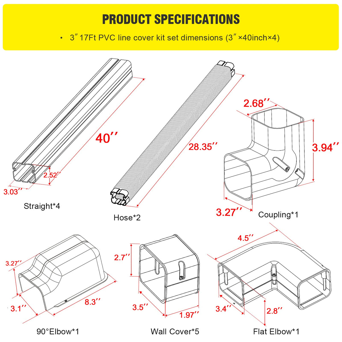Q: What is included in the DWALE 3" 17Ft PVC Decorative Line Set Cover Kit?A: The DWALE kit includes a 17-foot long line set cover that is 3 inches wide, designed to effectively conceal and protect the refrigeration pipes of ductless mini split air conditioners and heat pumps.