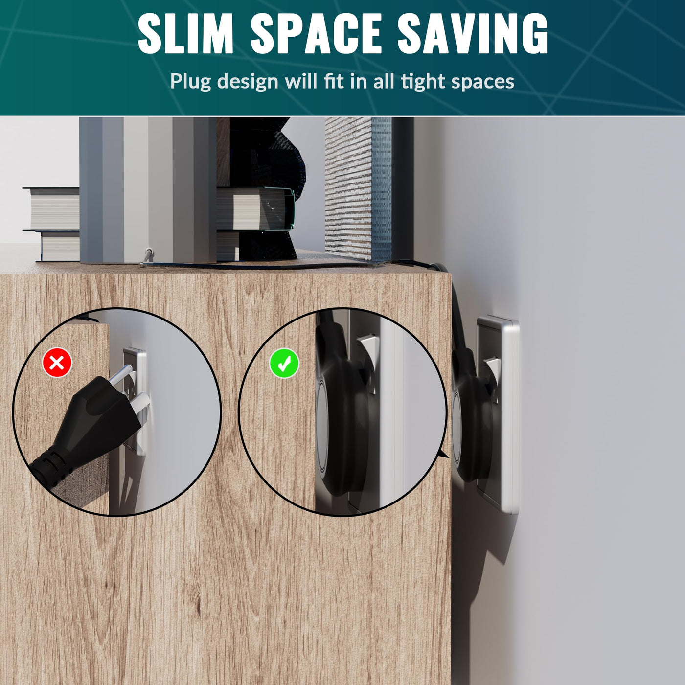 Q: What makes the Elecan Flat Plug Extension Cord different from standard extension cords?A: The Elecan Flat Plug Extension Cord features a unique 0.35-inch ultra-flat plug design that allows it to fit snugly in tight spaces and run under rugs without causing tripping hazards. Unlike standard round extension cords, this flat design optimizes outlet usage and prevents the blocking of adjacent outlets.