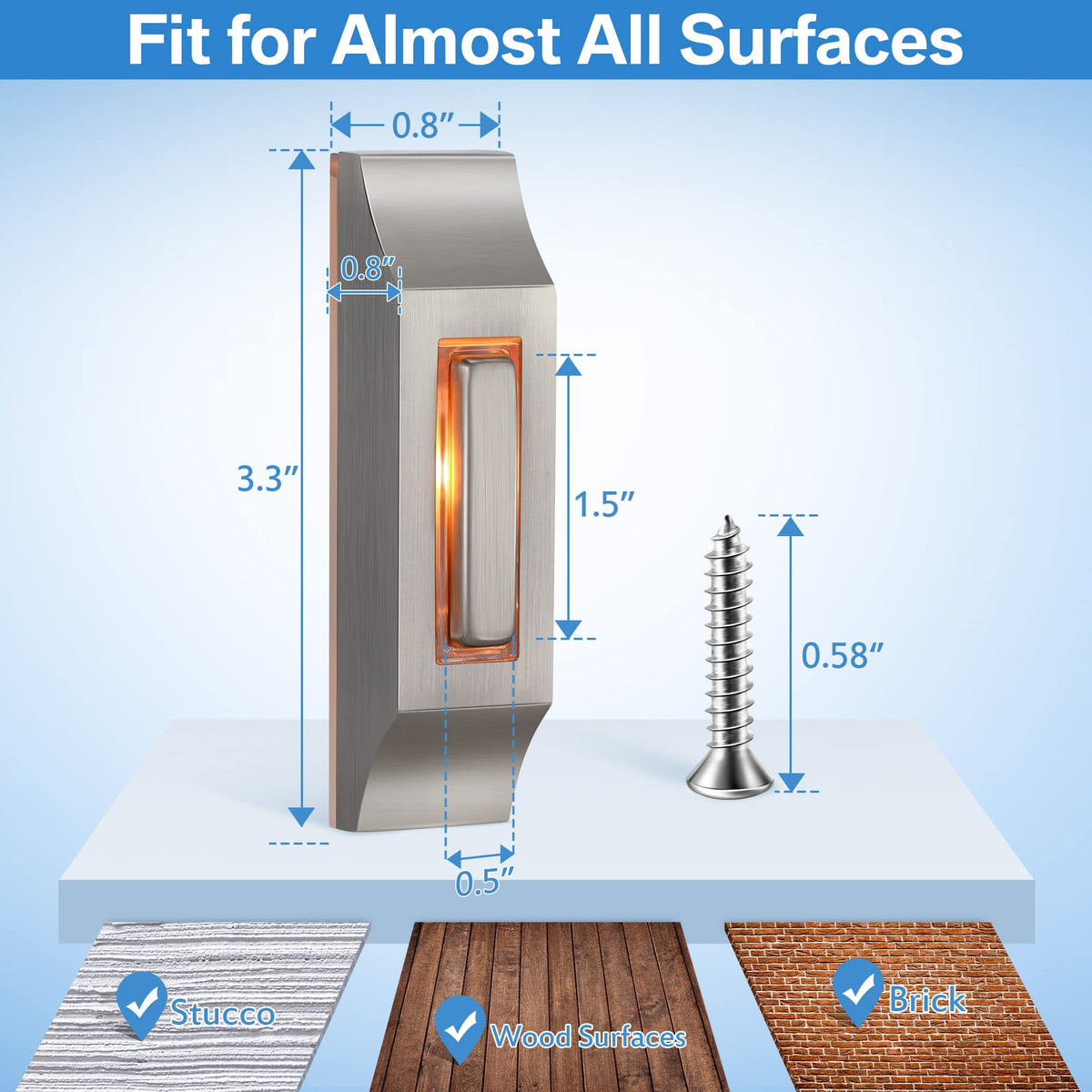 Q: Can this doorbell button be used on different types of surfaces?A: Absolutely! The Enhon Doorbell Push Button features a classic design that is suitable for various surfaces, including stucco and wood, making it versatile for front doors or garage door installations.