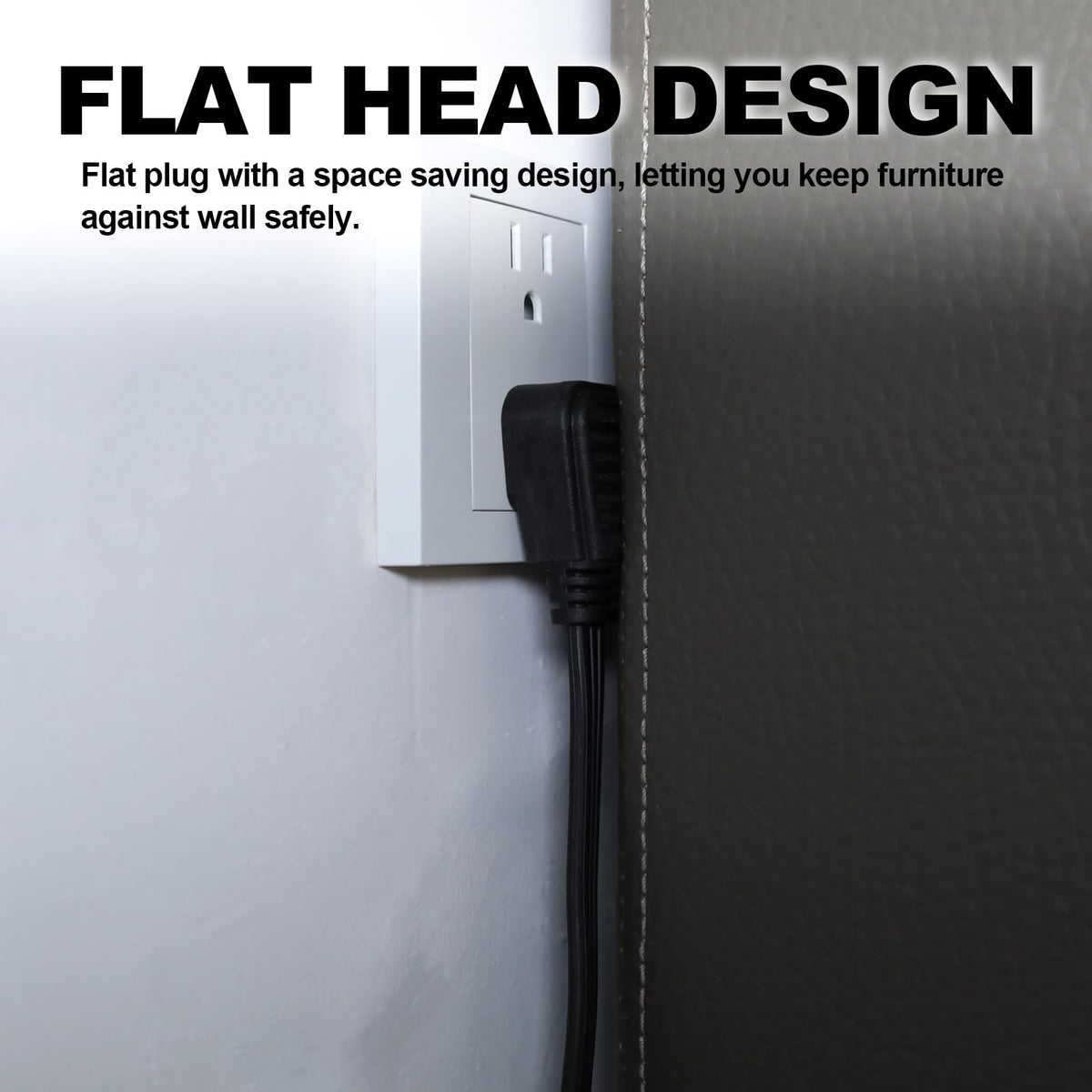 Q: How does the flat plug design benefit me?A: The flat plug design allows you to place furniture closer to the wall, saving space and reducing the risk of tripping over cords.