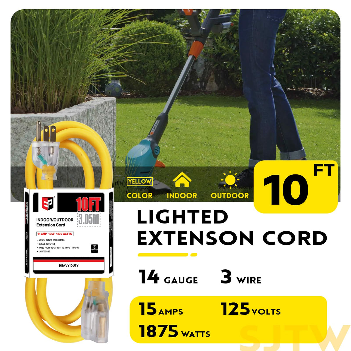 Ep 10 Ft 14/3 Lighted Outdoor Extension Cord 14 Gauge Sjtw Heavy Duty Yellow Extension Cable With 3 Prong Grounded Plug, Great