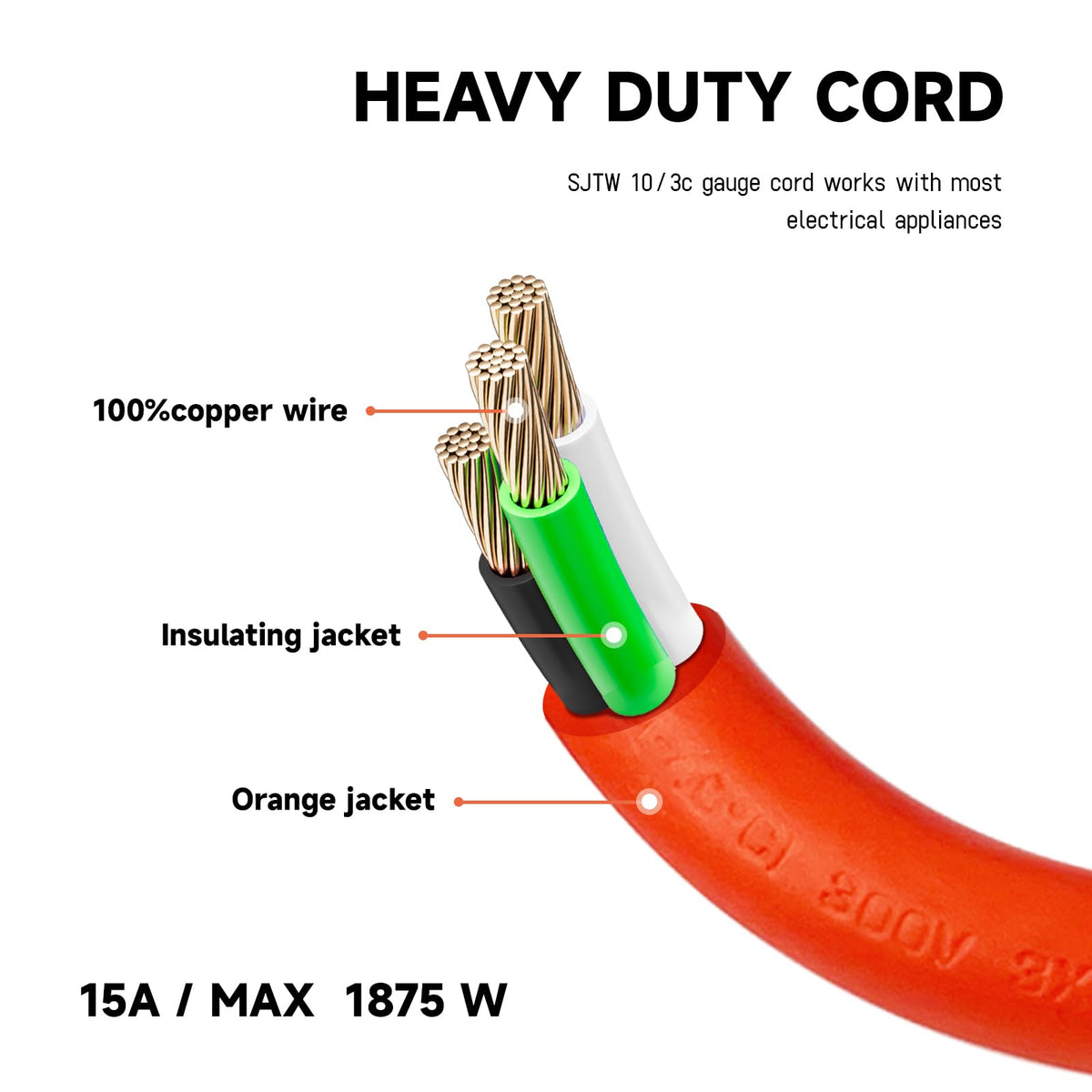 Certification: Ul Covering: Pvc Material + Sjtw Thermoplastic Wire Gauge: 10 Awg With 3 Conductors Grounded Amp Rating: 15A Max Voltage Rating: 125V Max Rated Power: 1875 Watts Use:Indoor / Outdoor
