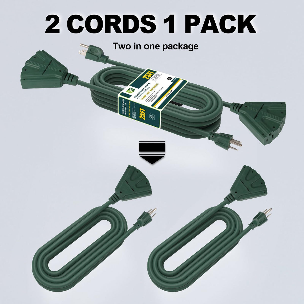 Ep 2 Pack 25 Ft Outdoor Extension Cord With 3 Electrical Power Outlets 16/3 Sjtw Green Cable With 3 Prong Grounded Plug For Sa