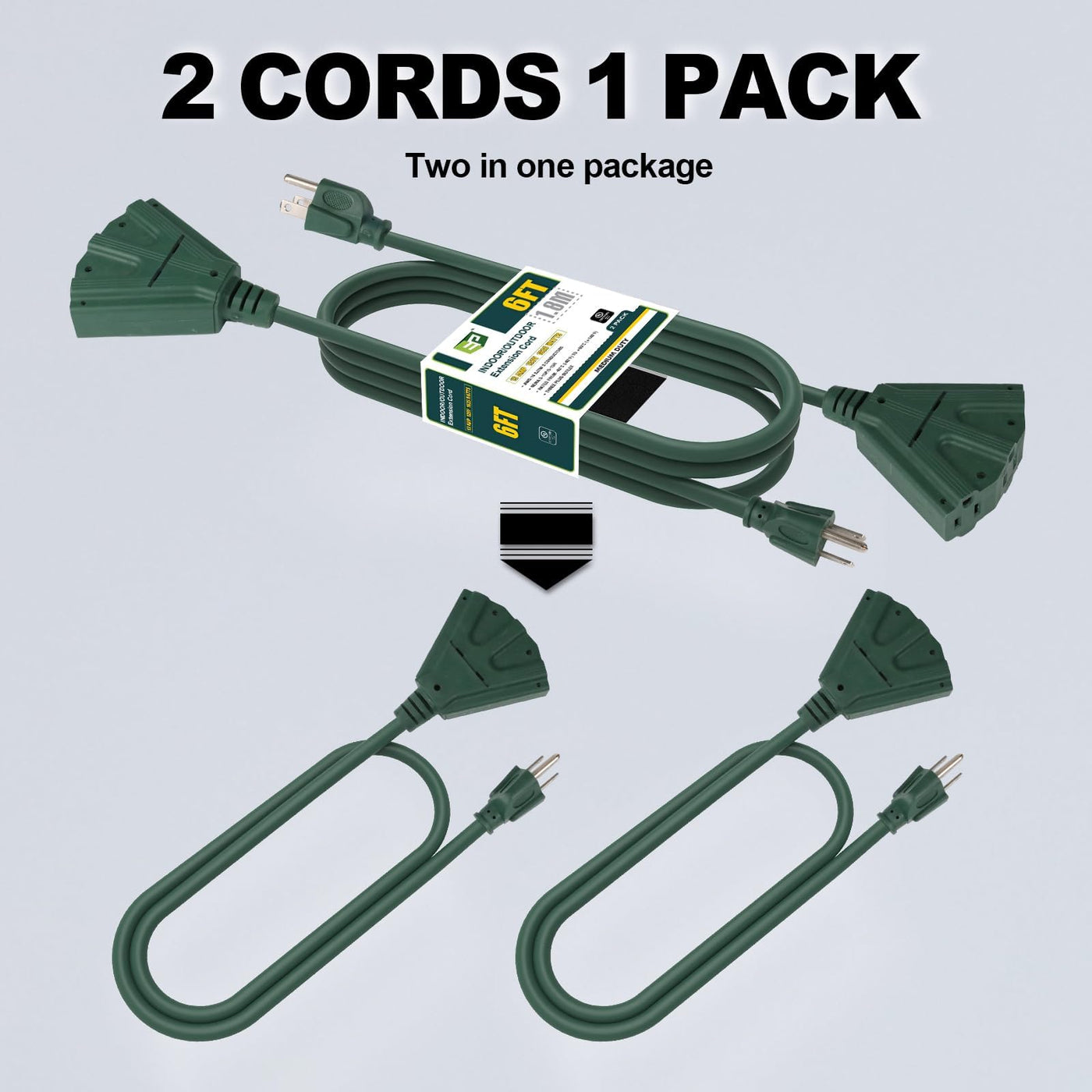 Ep 2 Pack 6 Ft Outdoor Extension Cord With 3 Electrical Power Outlets 16/3 Sjtw Green Cable With 3 Prong Grounded Plug For Saf