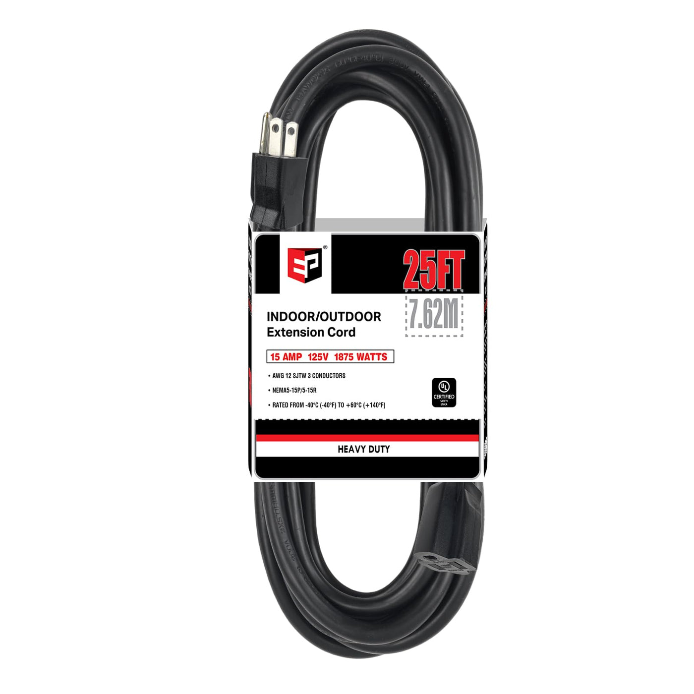 Q: What is the maximum power rating of the EP 25 Ft Outdoor Extension Cord?A: The EP 25 Ft Outdoor Extension Cord has a maximum power rating of 1875 Watts, making it suitable for various high-powered appliances and tools.