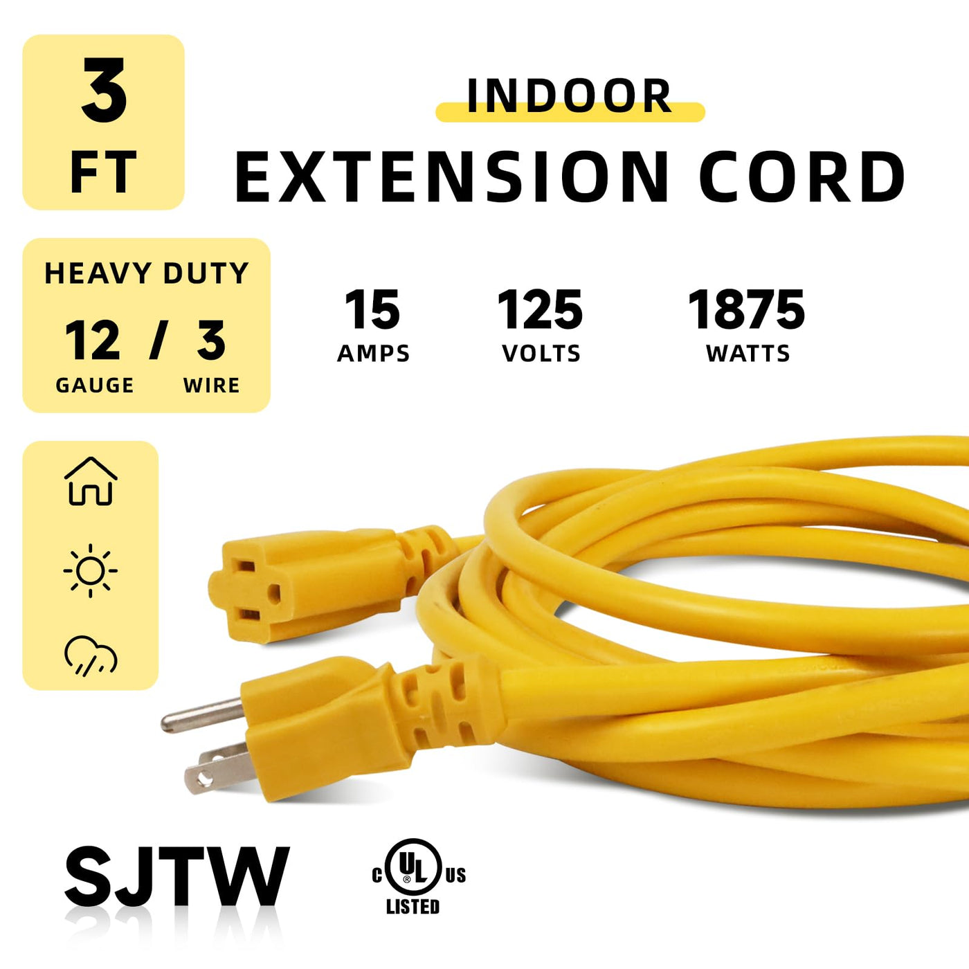 Certification: Ul Covering: Pvc Material + Sjtw Thermoplastic Wire Gauge: 12 Awg With 3 Conductors Grounded Amp Rating: 15A Max Voltage Rating: 125V Max Rated Power: 1875 Watts Use:Indoor / Outdoor