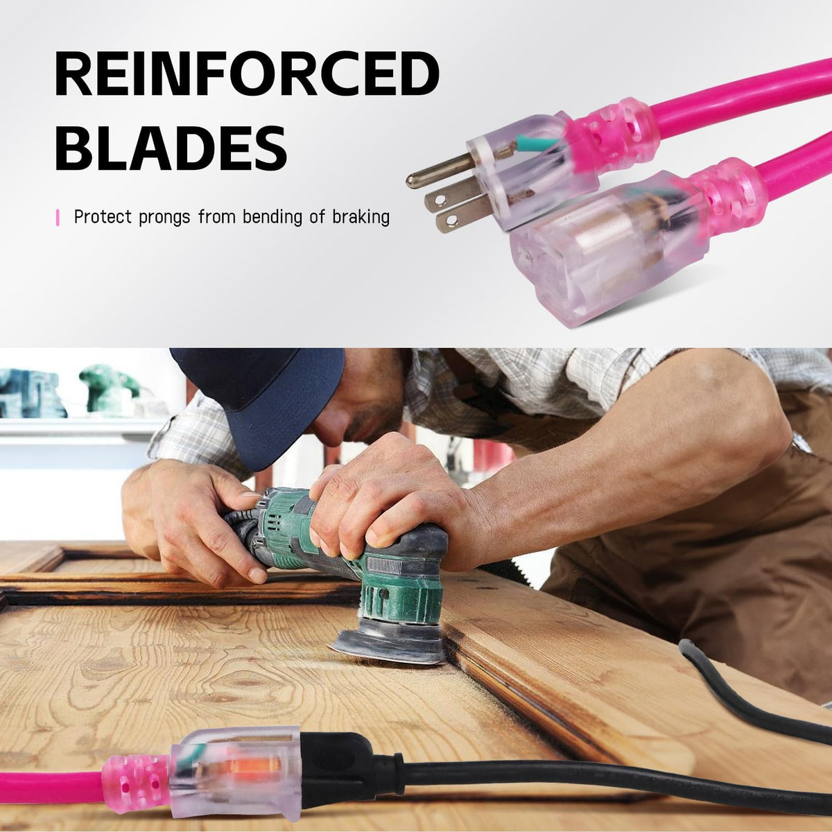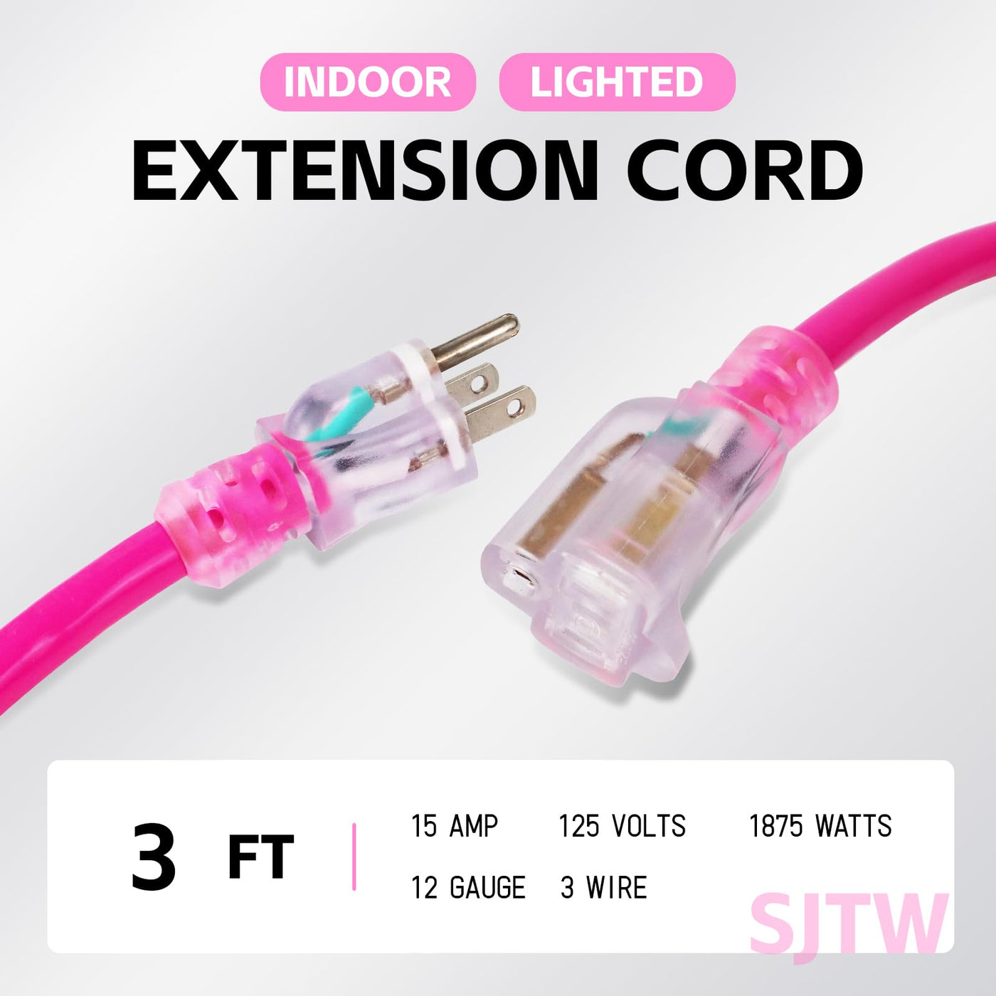 3 Ft Outdoor Extension Cord, 12/3 Sjtw Heavy Duty Waterproof Power Cable, 3 Prong Grounded Plug, Lighted End, For Lawn, Garden, Appliances, Pink