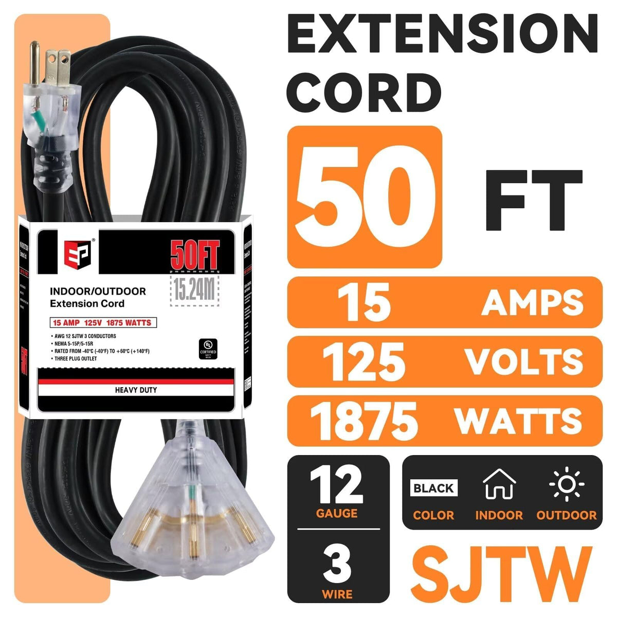Ep 50 Ft Lighted Outdoor Extension Cord With 3 Electrical Power Outlets 12/3 Sjtw Heavy Duty Black Extension Cable With 3 Pron