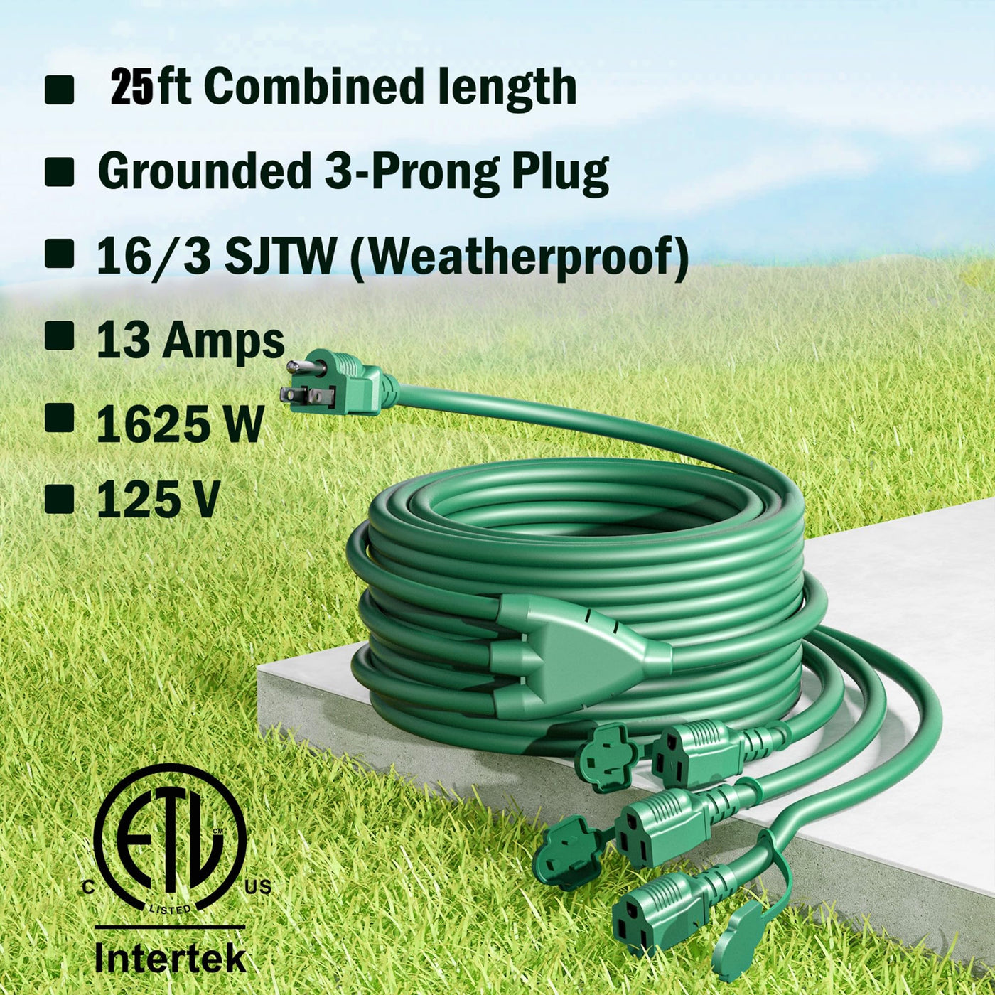 Eversimpleinc 1 To 3 Splitter Extension Cord (Combined 25 Ft, End To End 13 Ft), 3 Prong Plug With 3 Extended Outlets, With Weat