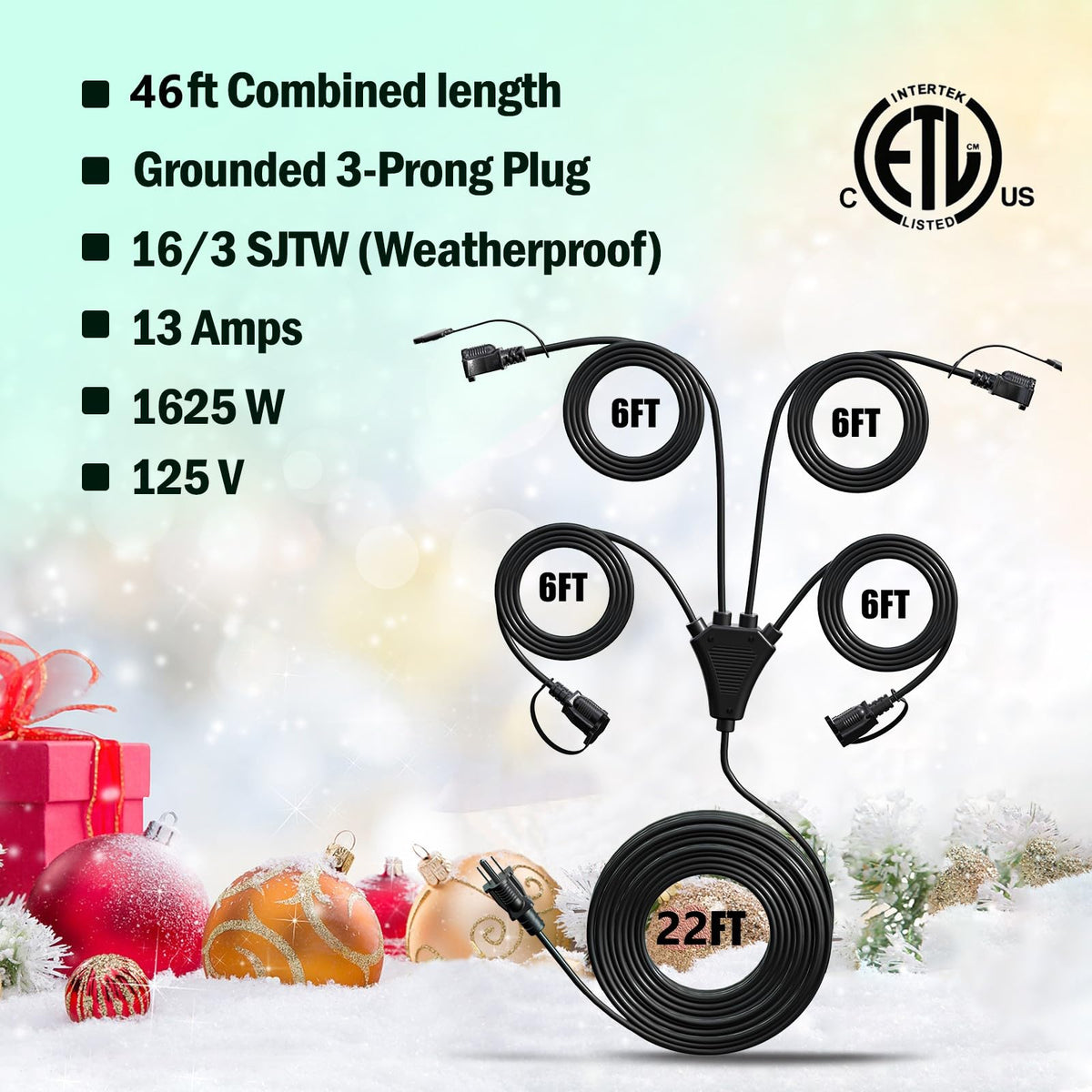 Q: What is the power rating of this splitter extension cord?A: The extension cord is ETL certified and has a maximum power rating of 13 amps, 125 volts, and 1625 watts, making it suitable for a variety of outdoor appliances.