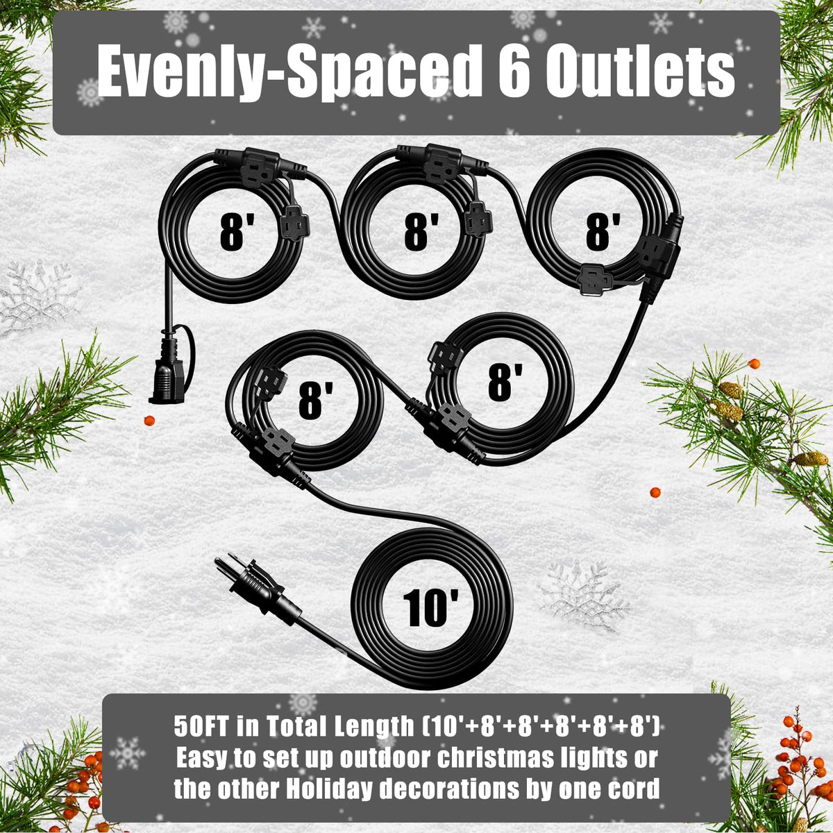 Black Outdoor Extension Cord With Multiple Outlets, (50Ft 6 Outlets) Evenly Spaced With Weatherproof Cover, Ideal For Christmas Decoration Patio, 16Awg/3C Sjtw, Etl Listed, Black Color Outdoor Extension Cord With Multiple Outlets, Evenly Spaced With Weatherproof Cover Green Cable Ideal For Christmas Holiday Decoration Garden Patio