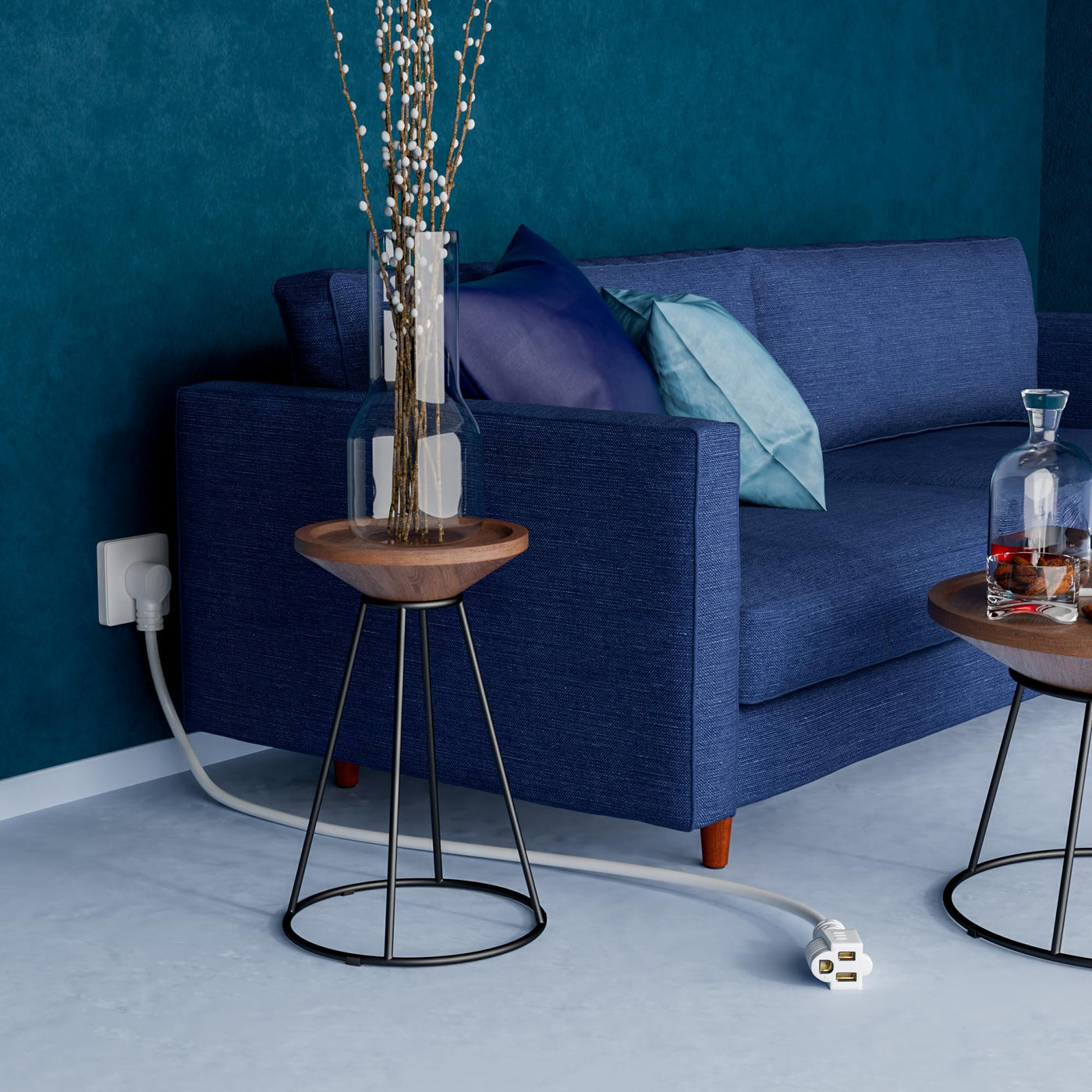 Q: What type of plug design does this extension cord feature?A: This extension cord features a 90-degree right angle plug design, which allows it to fit snugly against walls and behind furniture, maximizing space.