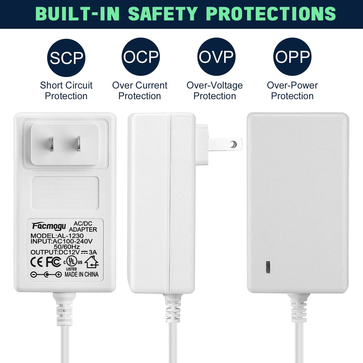 Facmogu 12V 3A Power Supply Adapter, Ac 100 240V To Dc 12 Volt Wall Plug Transformers, 36W Power Supply Adaptor With Ac To Dc Ba