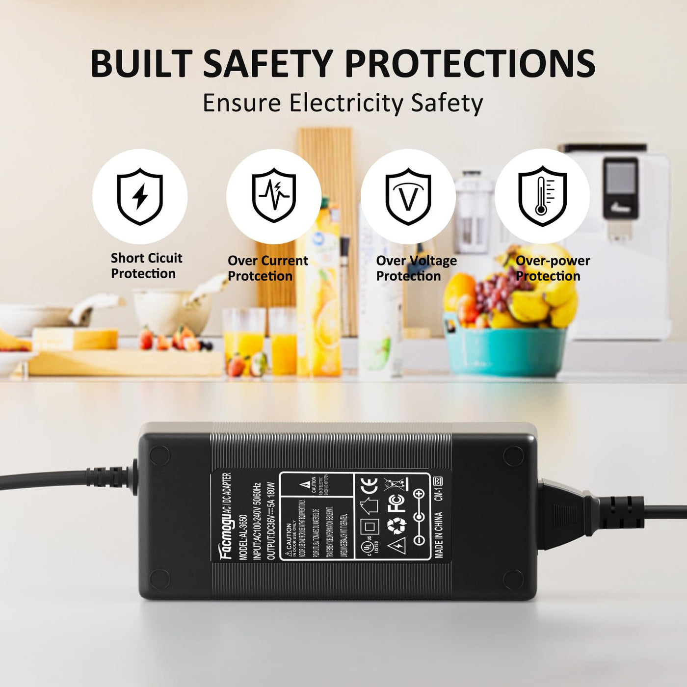 Q: Does the Facmogu power supply have any safety features?A: Yes, the Facmogu 36V 5A Power Supply Adapter is certified by UL and includes built-in safety features such as over voltage, over current, and over temperature protection to safeguard your devices from unexpected surges and spikes.
