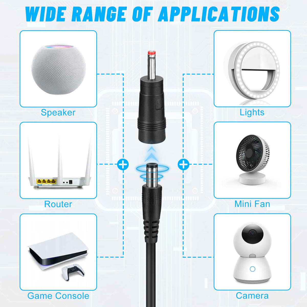Q: What devices can I power with the FARSENSE USB DC 5V to 12V Step Up Power Cable?A: The FARSENSE USB to DC 12V adapter is compatible with various low-power 12V devices, including wireless routers, smart speakers, smart cameras, light bands, game consoles, table lamps, breast pumps, mini fans, and development boards.