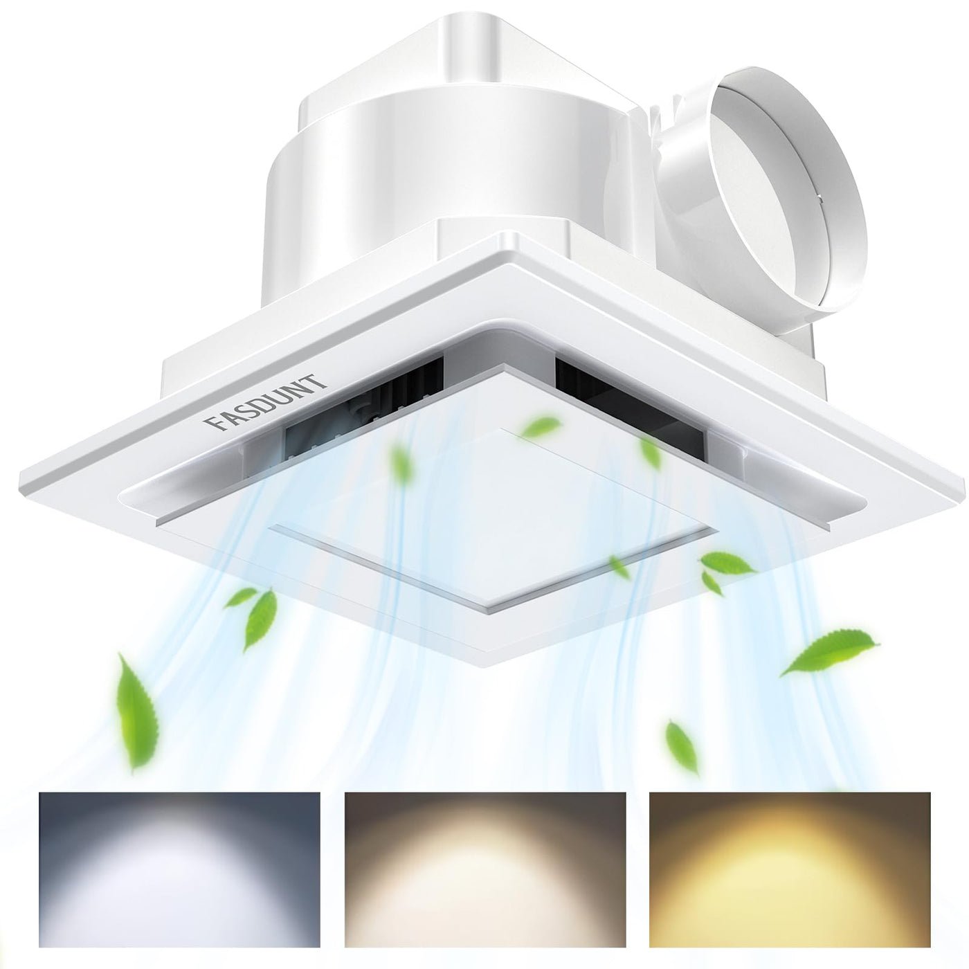 Q: Can I adjust the light color temperature on the FASDUNT Bathroom Exhaust Fan?A: Yes, the FASDUNT Bathroom Exhaust Fan features a 3-color light adjustable system. You can easily switch between 3000K warm yellow, 4000K natural light, and 5000K bright white by toggling the switch.