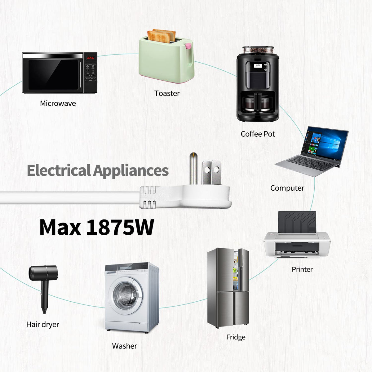 Q: What type of devices is this extension cord compatible with?A: This extension cord is compatible with most household devices, thanks to its NEMA 5-15 configuration, and is capable of handling a maximum power of 1875W.