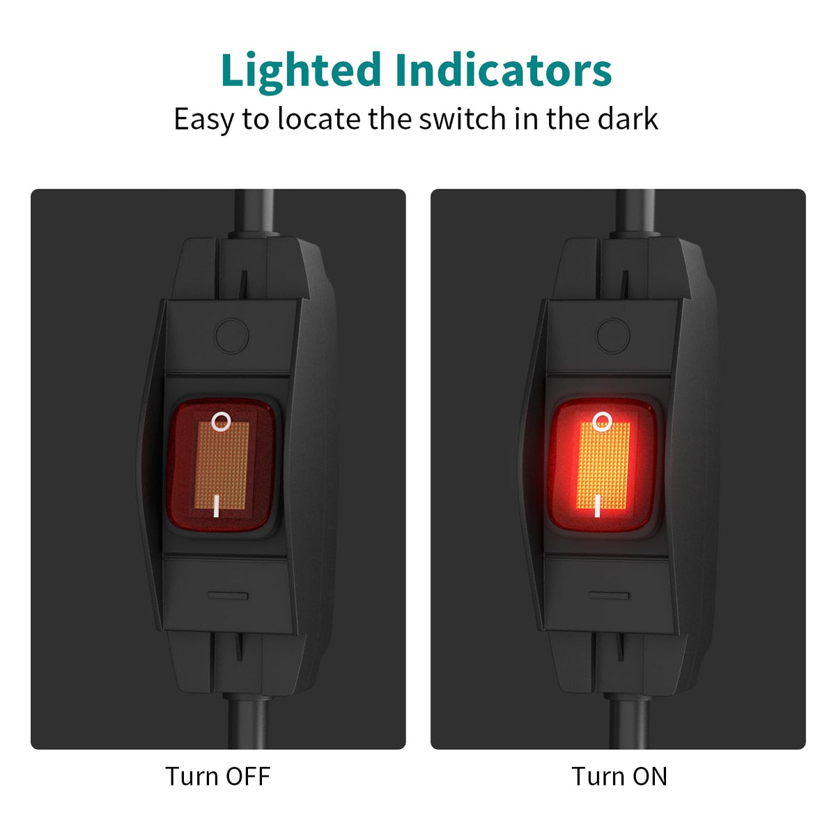 Q: How does the on/off switch function on this extension cord?A: The on/off switch is conveniently located in the middle of the FIRMERST extension cord. When you press the switch button, a red LED indicator lights up, making it easy to locate, especially in the dark.