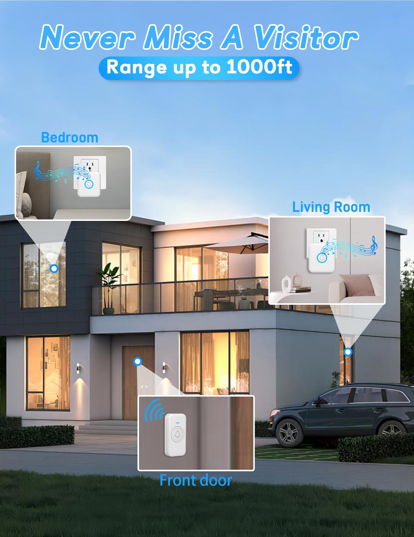 Q: What is the range of the FOVKSUC Wireless Doorbell?A: The FOVKSUC Wireless Doorbell offers an impressive reception distance of up to 1000 feet, ensuring you can hear the doorbell clearly from anywhere in your home or office.