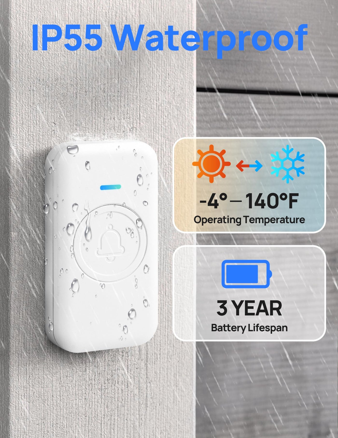 Q: Is the doorbell waterproof?A: Yes, the push button is IP55 rated, making it waterproof and able to withstand various weather conditions, such as rain and snow.