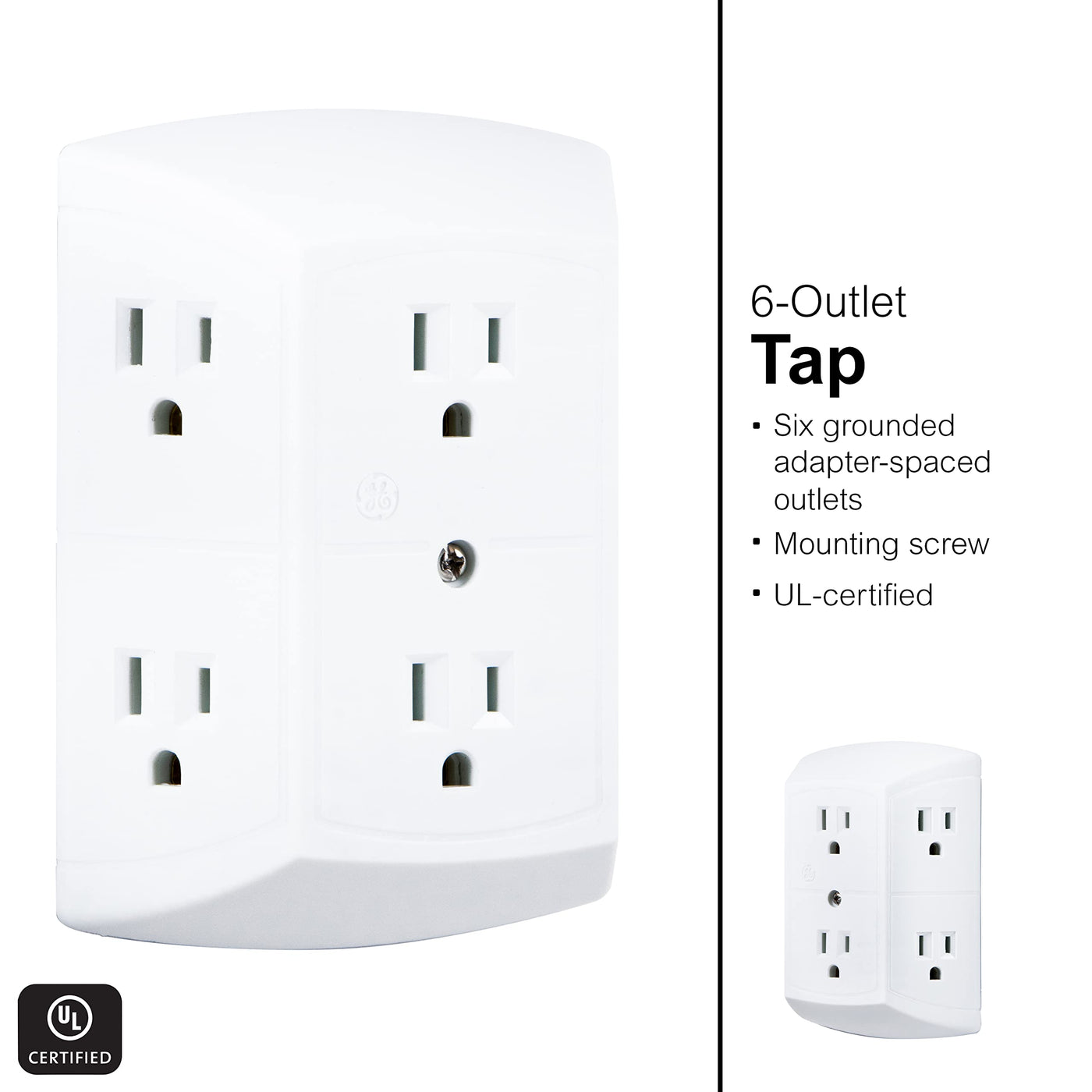Multiply Your Grounded Outlets Without The Cord Clutter Using The Set Of Two Ge 6-Outlet Grounded Taps. The Easy-To-Install Wall Tap Converts Two Grounded Outlets Into Six Outlets And Completely Covers The Existing Wallplate For A Seamless Look. The Unique Design Accepts Three Bulky Adapters And Three Standard Plugs. For Quick, Temporary Installation, Simply Plug The Tap Into A Grounded Duplex Wall Outlet. For Permanent Installation, Simply Remove The Existing Wallplate, Plug The Tap Into A Duplex Wall Outlet And Use The Provided Center Mounting Screw. The Tap Is Ideal In Home Or Office Setups And The Perfect Addition To Seasonal Lighting. Use The Tap For Appliances On Kitchen Counters, Where Space Is Limited. The Wall Tap Is Ul Listed And Backed By The Highest Standards Of Safety And Performance. Safe For Indoor Use With Most Household Electronics, This Wall Tap Features A 125Vac/15A/1875W Maximum Electrical Rating. The Ge 6-Outlet Grounded Tap Offers A Quick And Easy Solution That Expands Your Outlets.