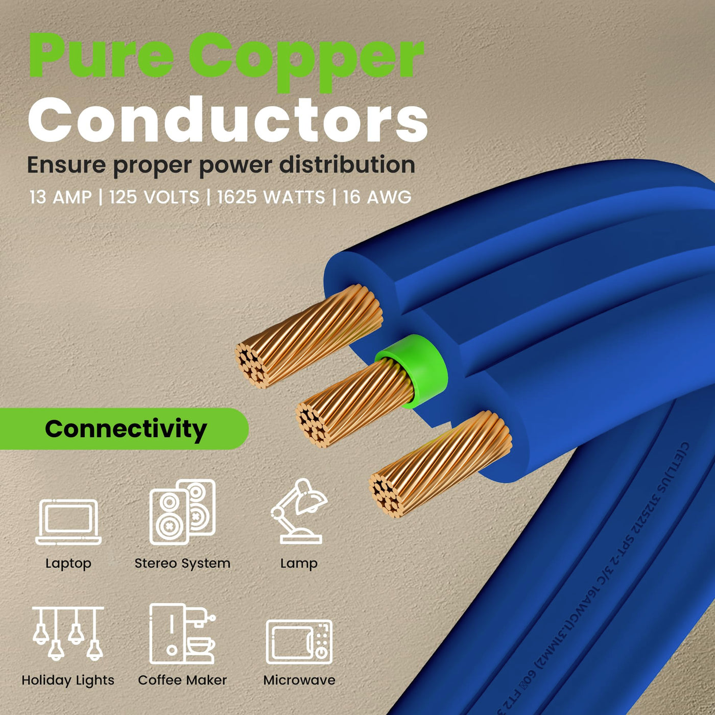 Q: Is the extension cord safe to use with high-power devices?A: Absolutely, this extension cord is ETL Certified and features a 3-prong grounded plug, ensuring safety and reliability. It can deliver up to 13 Amps and 1625 Watts of power, making it suitable for a variety of electrical needs.