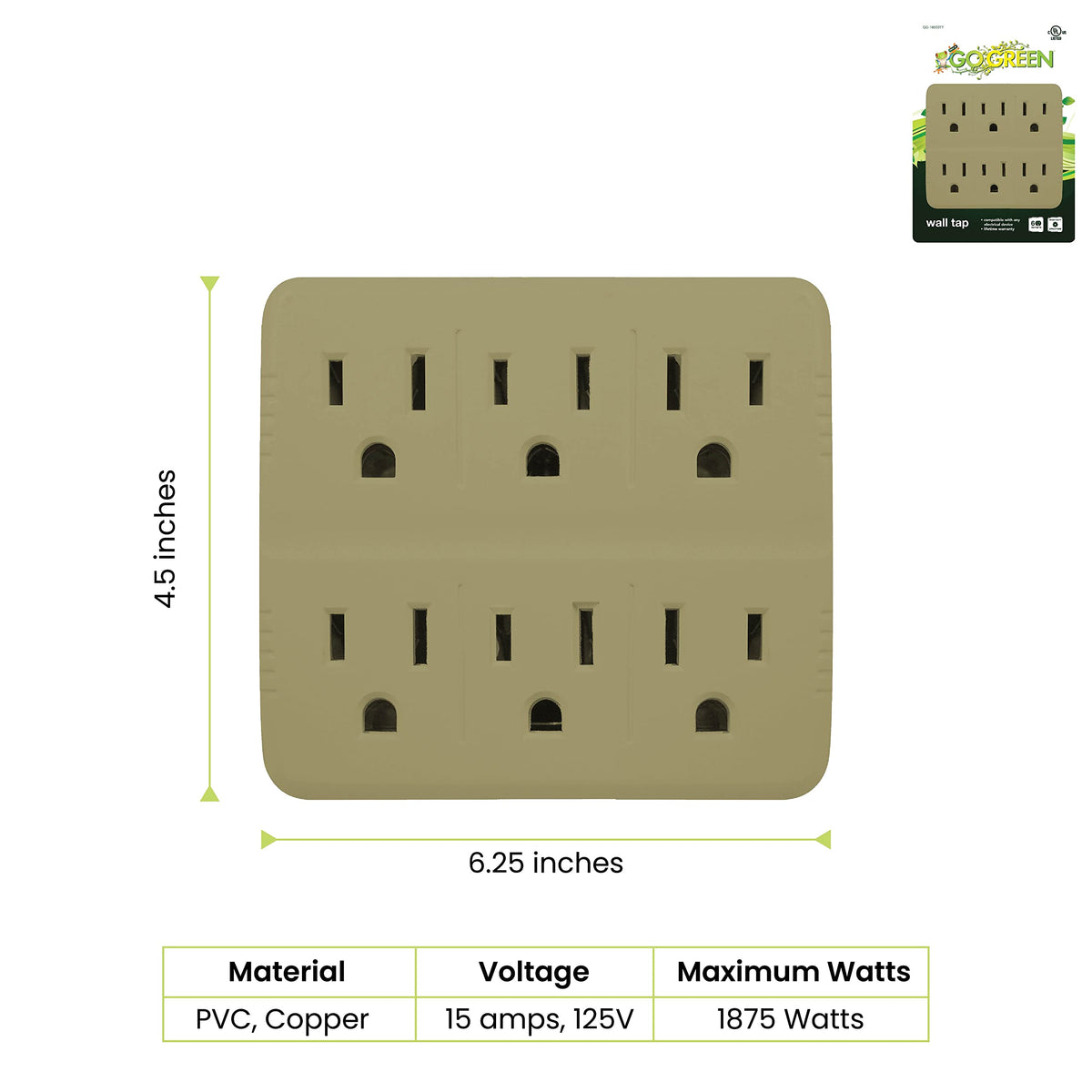The Gogreen Power 6 Outlet Wall Tap Allows You To Quickly Turn Two Outlets Into Six Outlets. The Wall Tap Was Designed Using Reinforced Plastic For Stability And To Allow For Bulky Adapters To Be Used All At The Same Time. Each Outlet Is Grounded And Unit Is Ul Certified To Meet All Industry Standards. The Wall Tap Is The Ideal Item To Keep Around Your Home, Office And Garage.