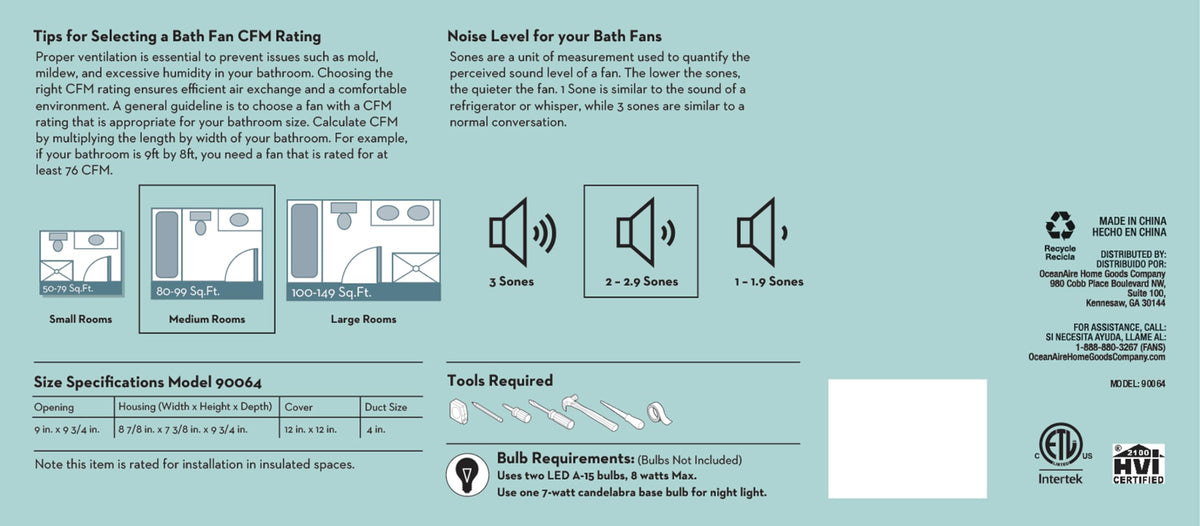Q: What type of bulbs does the Good Housekeeping 90064 Buckingham Bathroom Fan require?A: The Good Housekeeping 90064 Buckingham Decorative Bathroom Ventilation Exhaust Fan requires two A15 60W bulbs, which are not included with the product.