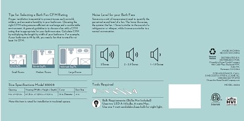 Q: How loud is the ventilation fan during operation?A: This bathroom ventilation exhaust fan operates at a sound level of 3.0 sones, which is considered relatively quiet, making it suitable for use in various bathroom settings without causing disturbance.