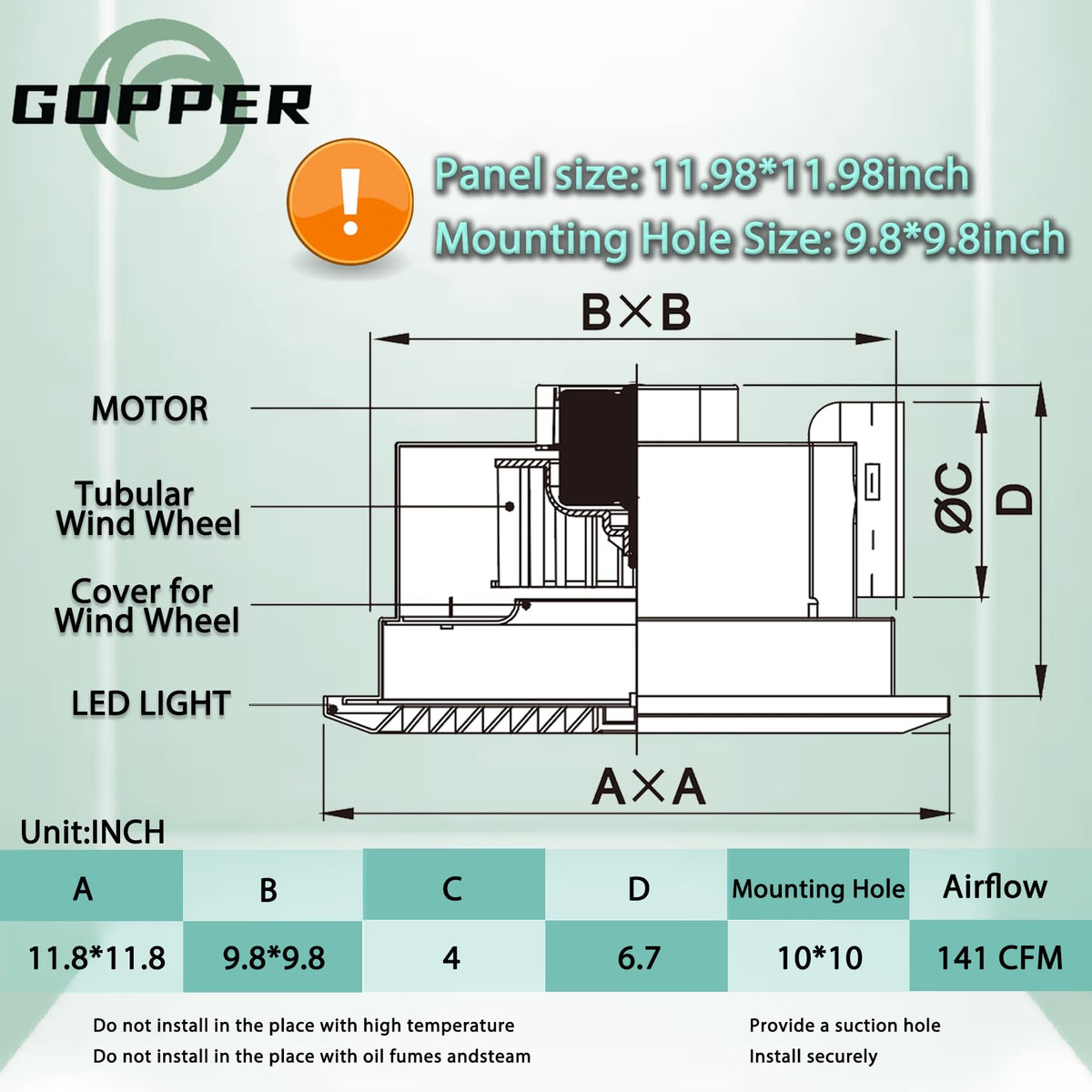 Q: How easy is it to install the Gopper Bathroom Exhaust Fan?A: Installation is hassle-free with the Gopper fan. Simply align the 10x10 inch mounting holes, secure the 4" duct connections, and snap the white grille into the 12x12 inch panel, following the included illustrated guide.
