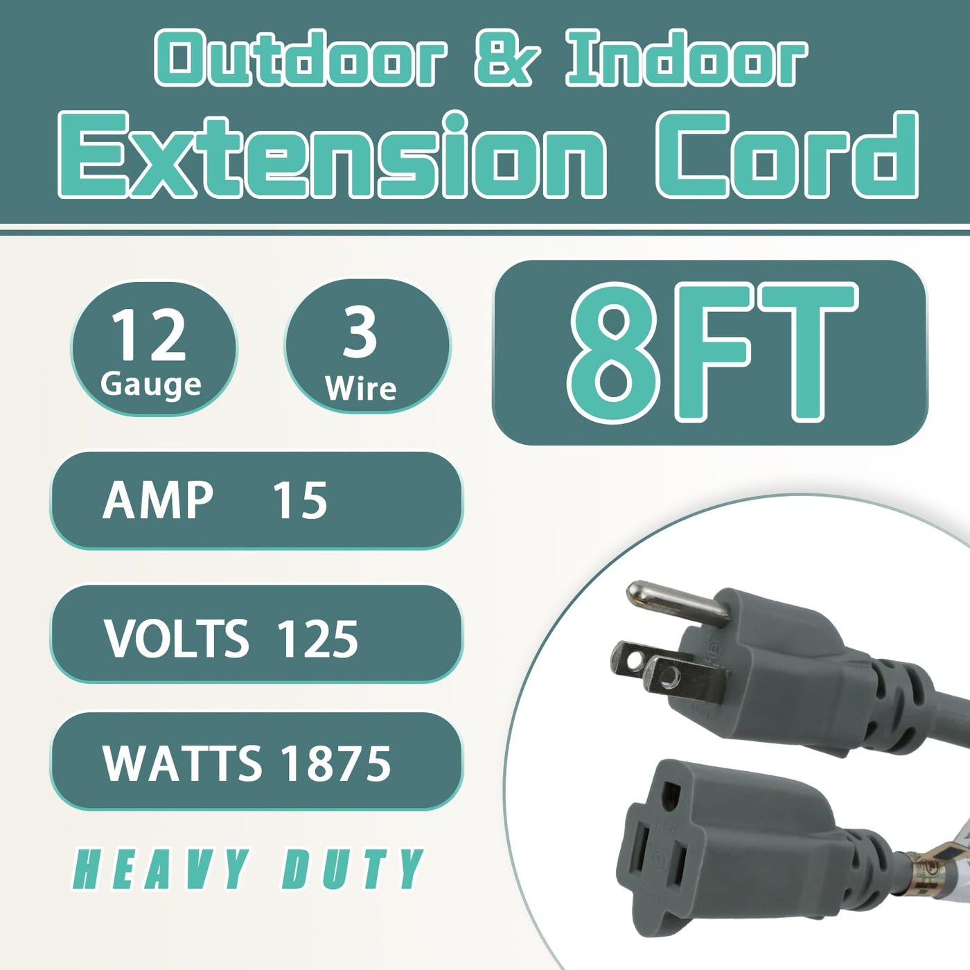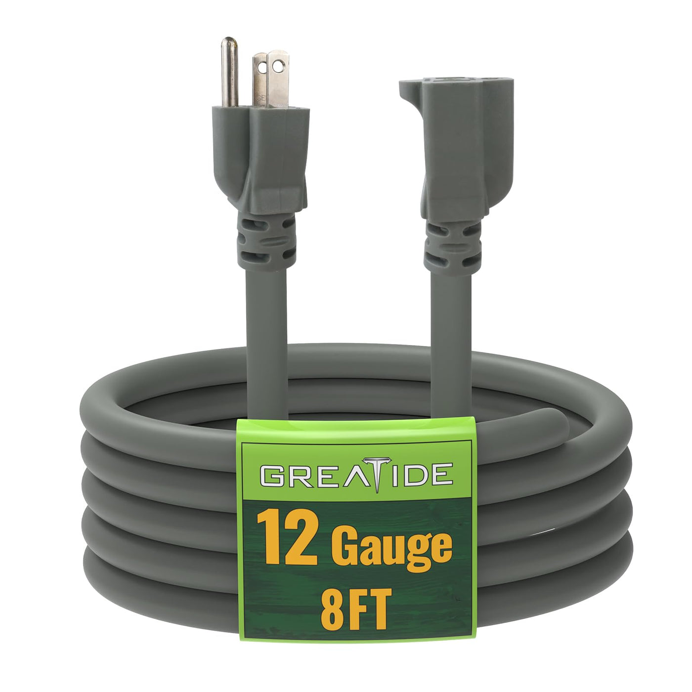 Greatide 8 Ft Outdoor Extension Cord 12/3 Sjtw Heavy Duty Grey Extension Cable With 3 Prong Grounded Plug Power Cord For Law