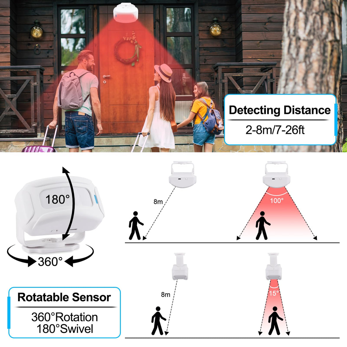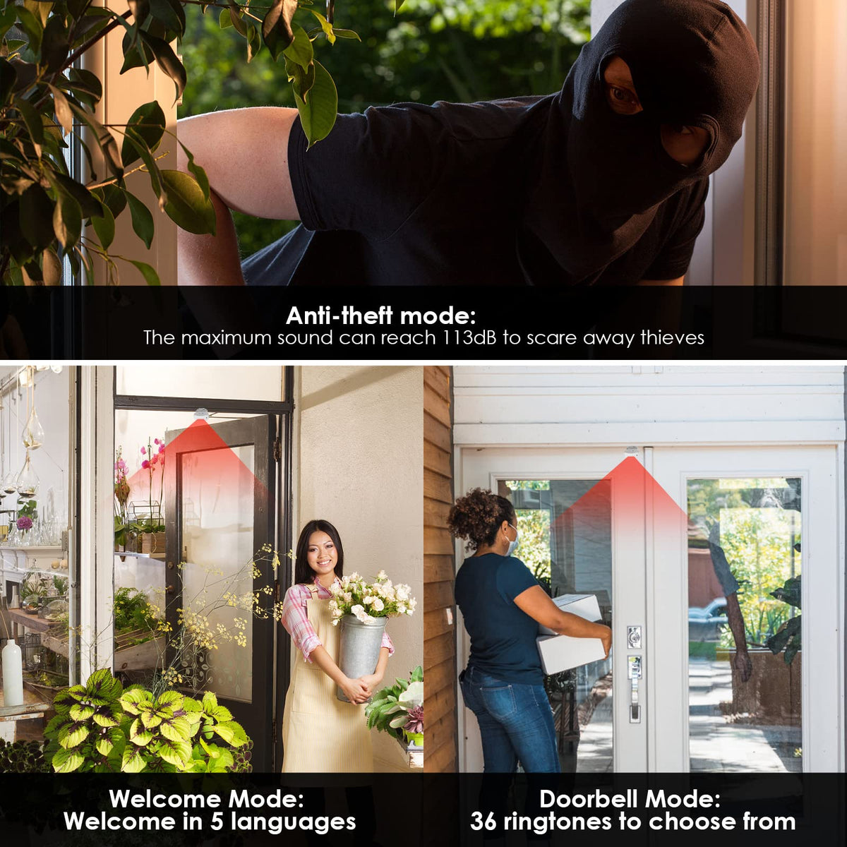 5 Model Welcome Languages And 36 Ringtones: You Can Choose Your Favorite Ringtone For Your Home Or Store. 4 Level Volume Adjustable:Welcome/Doorbell/Alarm Model Has 4 Level Volume Adjustable, 113-25Db.So You Don'T Need To Worry About The Volume Is Too Loud Or Too Small. 4 Brightness And Color Selectable:Color Light Or Lighting Mode Is Silent And Has 4 Levels Of Brightness Adjustable. You Can Choose These Two Modes When You Don'T Want To Be Disturbed By The Ringtone. The Color Light Model Also Has 4 Colors Selectable, You Can Set Different Colors For Different Doors. Expandable Wireless Home Security:Each Receiver Of This Motion Sensor Detects Alarm Can Work With 32 Infrared Transmitter/ Magnetic Sensor And 8 Remotes At Most. Wide Wireless Range:Open Places Working Range Up To 280M/918Ft Between The Receiver And Infrared Transmitter. Detection Range Of The Infrared Sensor Approximately 4-8M/13-26Ft.If The Device'S Working Distance Becomes Shorter, Please Replace The Battery Or Recharge It In Time. Memory Function:Remember Your Last Set Melody And Volume Level After Power Off, Then Don'T Need To Reset To Your Previous Settings Again. Wide Applicable:Very Suitable For All Kinds Of Shops, Upscale Clubs, Hotels, Offices, Factories, Homes, Banks, Store,Garage, Supermarket, Boutique,Villas, Mailbox, And So On.Can Be Used As A Doorbell During The Day, And Converted Into An Anti-Theft Alarm At Night. 5 Modes Switchable:1 Welcome,2 Doorbell, 3 Alarm,4 Color Light, Lighting Model,5 Modes Cyclically Switch Receiver Power Supply: Micro Usb (Not Included) Or Aa Alkaline Battery X 3 (Not Included) Infrared Transmitter Power Supply: Micro Usb (Not Included) Or Aaa Alkaline Battery X 3 (Not Included) Working Temperature: -14-90 F Transmitter Detection Angle: Up And Down 360 Degree, Left And Right 360 Degree