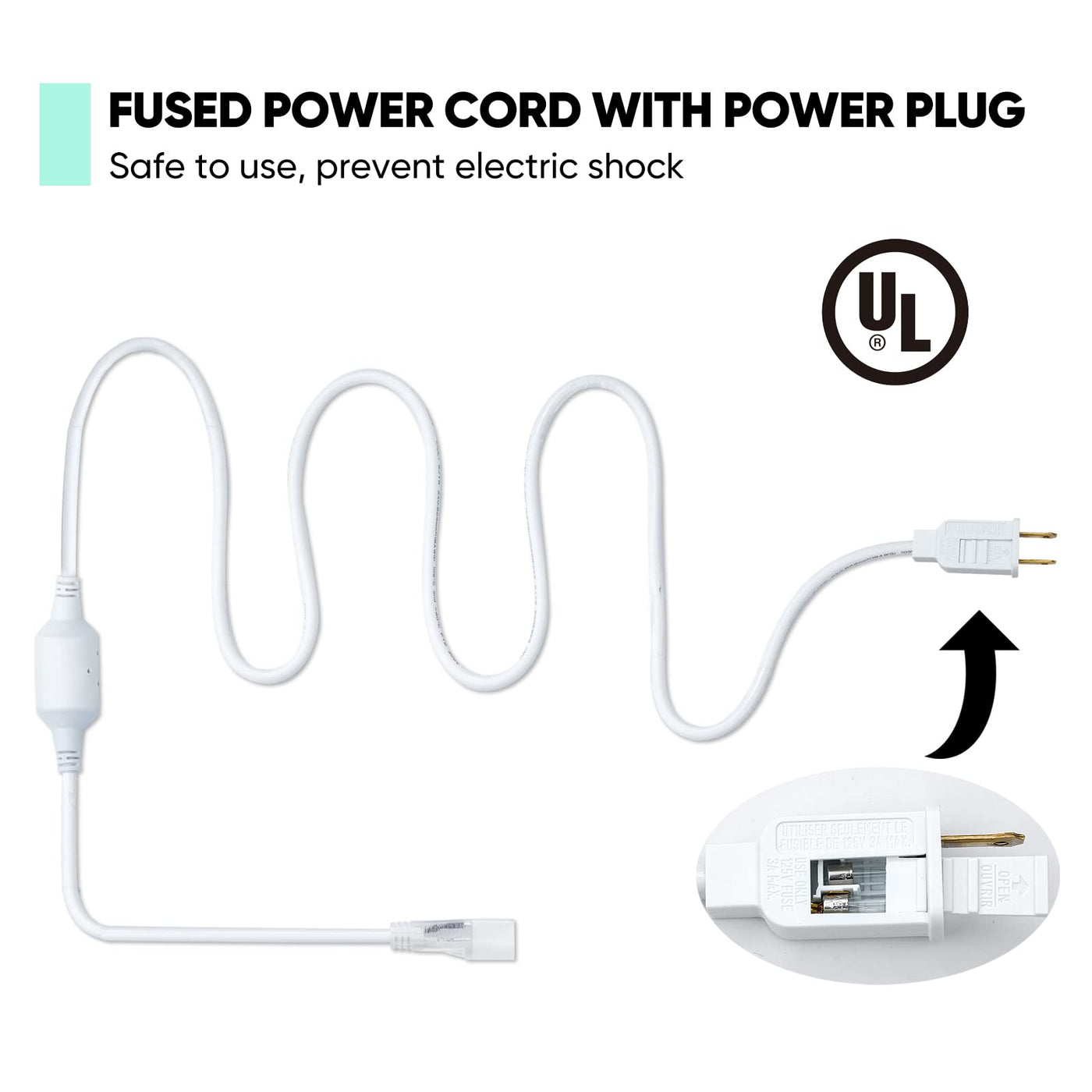 Q: How do I safely install the power cord connector kit?A: To install the power cord connector kit safely, first disconnect the power. Cut the neon rope according to the '✂' mark, ensuring the sharp prongs of the pin align with the '→' mark. Insert the round prongs into the power cord, then plug it into an outlet to test.