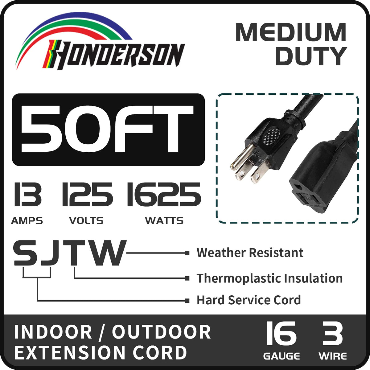 Q: What is the maximum power rating of the HONDERSON 50FT Outdoor Extension Cord?A: The HONDERSON 50FT Outdoor Extension Cord has a maximum power rating of 13A and can handle up to 1625W.