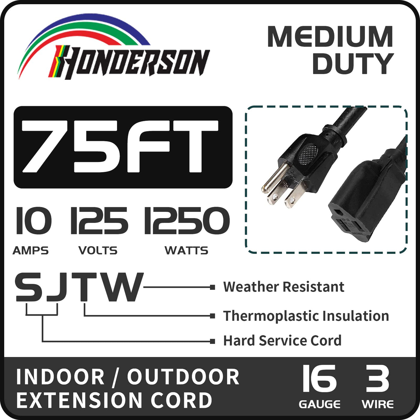 Q: What is the maximum power rating for the HONDERSON 75FT Outdoor Extension Cord?A: The HONDERSON 75FT Outdoor Extension Cord has a maximum power rating of 10A, which supports up to 1250W of power.