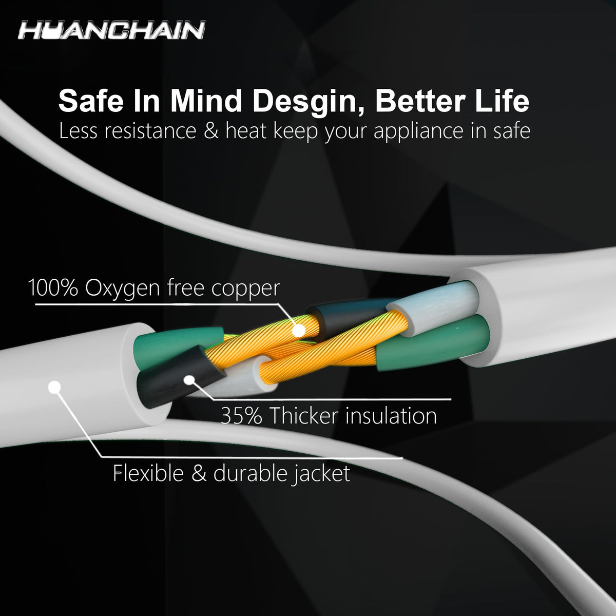 Q: How flexible is the HUANCHAIN extension cord?A: The HUANCHAIN extension cord is made from high-flexible vinyl, providing excellent bending resistance. This flexibility prevents the cord from breaking during long-term movement, bending, or pulling.