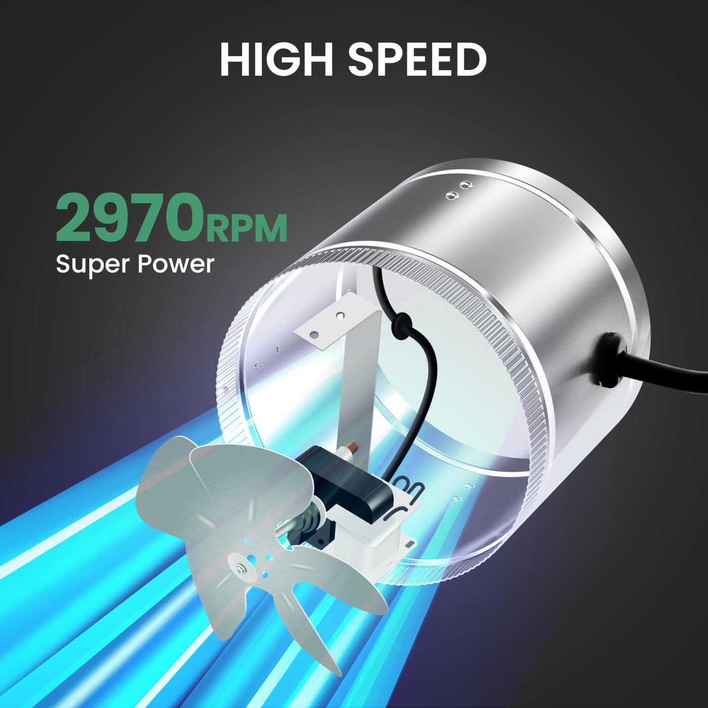 Q: What are the main features of the iPower 8 Inch Inline Duct Fan?A: The iPower 8 Inch Inline Duct Fan features a compact design with a diameter of 8 inches, a speed of 2970 RPM, and an airflow capacity of 420 CFM. It has a high-quality balanced centrifugal impeller, a durable housing, and operates quietly at a noise level of 43 dB, making it ideal for various applications.