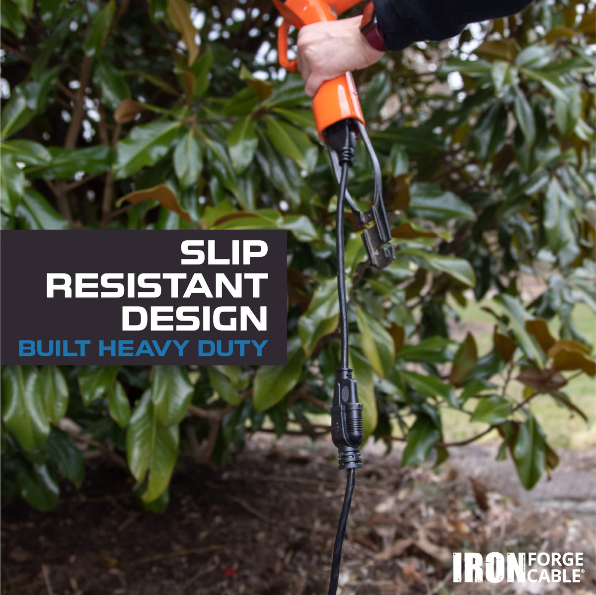 Q: How does the slip-resistant design of this extension cord benefit users?A: The slip-resistant design of the Iron Forge Cable extension cord enhances safety by preventing accidental disconnections during use, making it ideal for outdoor projects and landscaping tasks.