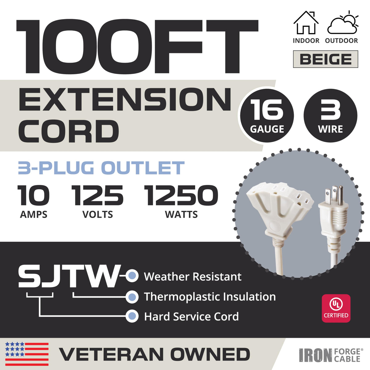 Iron Forge Cable 100 Ft Beige Outdoor Extension Cord With 3 Outlets 16/3 Sjtw 100Ft Extension Cord 3 Prong, 10 Amp All Weather
