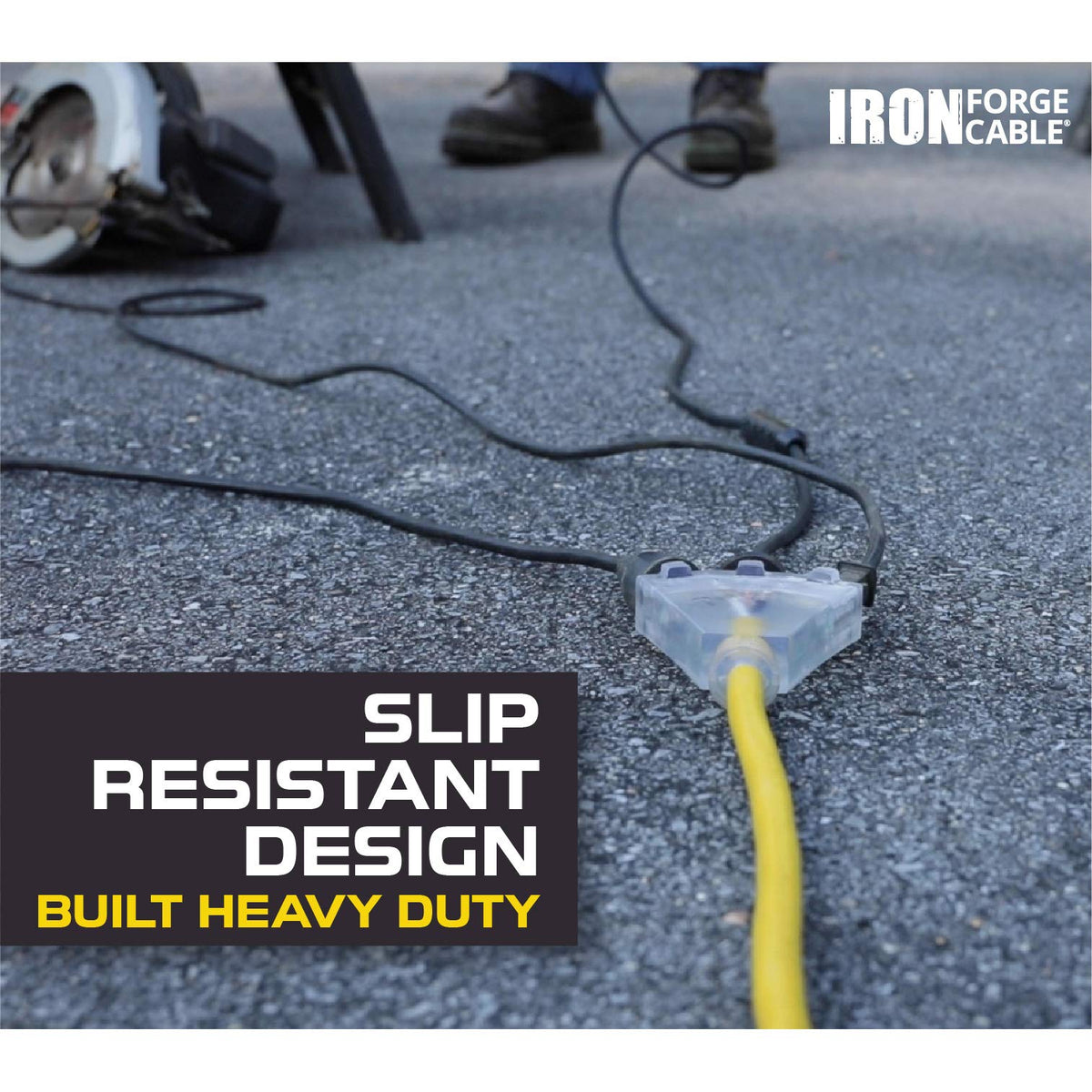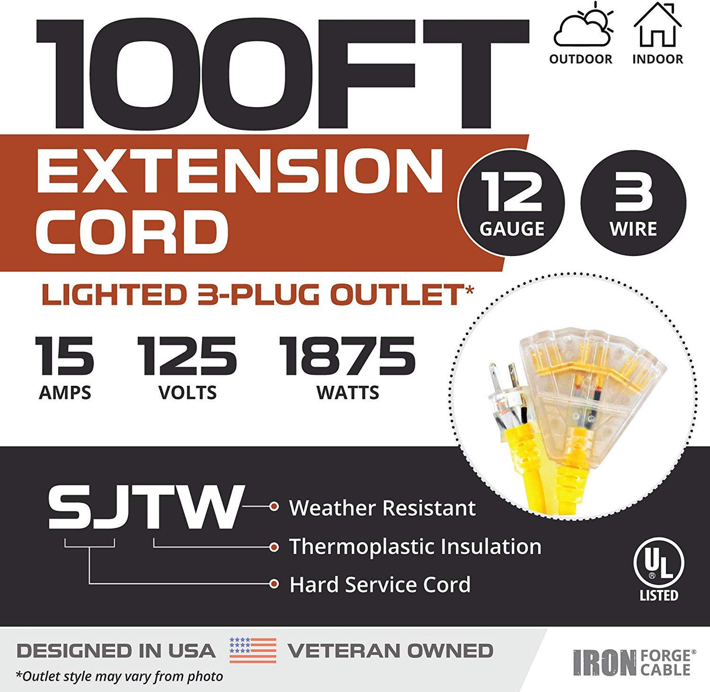 Extra Heavy Duty Extension Cord For Indoor And Outdoor Use. Great For Gardening, Landscaping, Or Powering Any Household Appliance.3 Outlets In 1 For Simultaneous Multiple Use. Water Resistant: Flexible Vinyl Covering Protects Cords Against Moisture, Abrasion And Sunlight.Reinforced Blades: The Nickel-Coated Protects Prongs Of This 100' Heavy Duty Extension Cable With Multiple Plugs From Bending Or Breaking, And Help Secure The Plug Firmly In Place. This Ensures That The Cord Functions Well, Stays In Place, And Remains In Good Condition, And Helps This Cord Last You For Years.Ul Certified: 12 Gauge Heavy Duty Wire, 100 Foot, 15 Amp, 125 Volt, 1875 Watt, 5-15P/R, Ul Certified100% Satisfaction Guaranteed: Us Veteran Owned - Iron Forge Cable, A U.S. Veteran-Owned Business, Stands Behind Its Extension Cords. If Any Issues Arise, A Replacement Will Be Given.