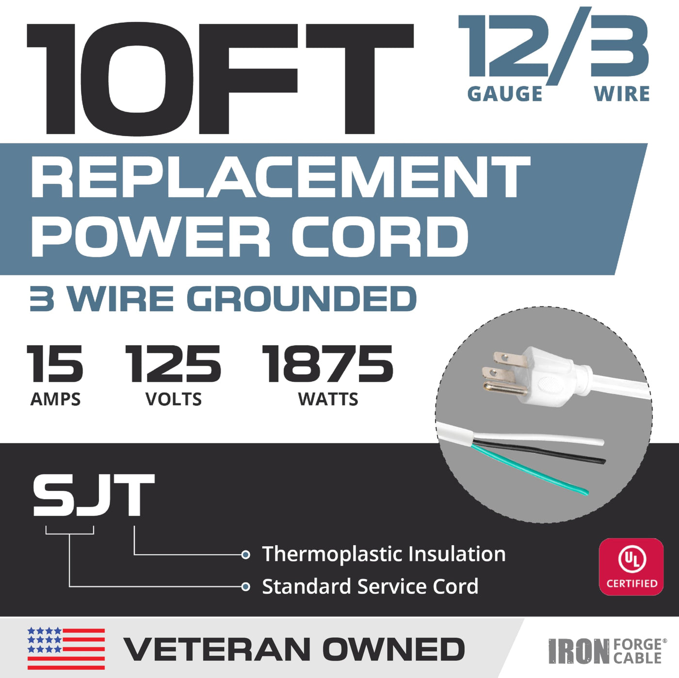 Iron Forge Cable 12 Gauge Power Cord Replacement 10Ft,15 Amp White Heavy Duty Extension Cord, 12/3 Sjt 3 Prong Electric Cable
