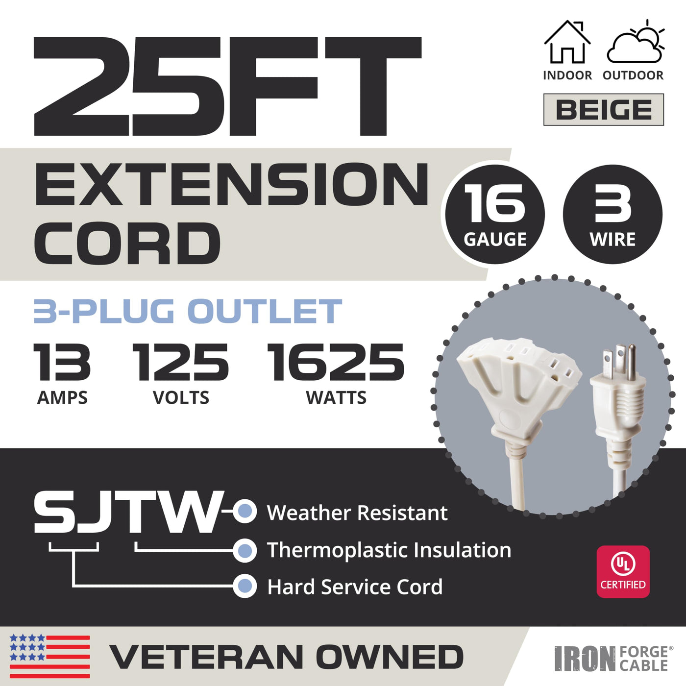 The Iron Forge Cable 25 Ft Beige Outdoor Extension Cord With Mulitple Outlet Is The Perfect Blend Of Functionality And Durability, Designed To Meet Your Indoor And Outdoor Power Needs Effortlessly; This Long Outdoor Extension Cord Features A Flexible Yet Rugged Design That Ensures Long-Lasting Performance In All Weather Conditions, Making It Ideal For Powering Appliances, Tools, Or D Cor; Built As A Heavy Duty Extension Cord 25Ft, It Includes Reinforced Nickel-Coated Blades, A Durable Vinyl Jacket, And A Grounded Plug For Safety, While Its Neutral Beige Color Allows The Extension Cord Indoor 25 Ft To Blend Seamlessly With Your Space, Ensuring A Reliable And Convenient Solution Whether You Need A 25 Ft Extension Cord 3 Prong For Your Garden, Workspace, Or Holiday Lighting; Ul-Certified And All-Weather Resistant, This 25 Extension Cord 3 Prong Is Built To Withstand Extreme Temperatures, Ensuring Hassle-Free Use And Reliable Performance Wherever You Need It.